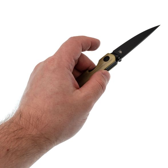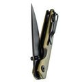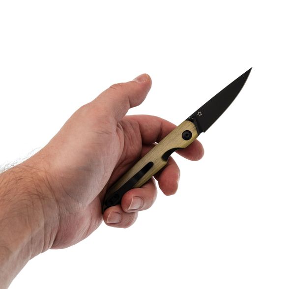 Клинок ножа выполнен из стали 154CM — популярной нержавеющей стали среднего ценового сегмента. Этот материал обеспечивает высокую коррозионную стойкость и длительное удержание заточки, оставаясь одной из самых сбалансированных сталей для ножей. Черное покрытие клинка гармонично сочетается с рукоятью и дополнительно защищает металл от воздействия внешней среды. Универсальный профиль клинка Drop-Point с прямыми спусками от тонкого обуха делает нож удобным как для реза, так и для прокалывания, что идеально подходит для ежедневного ношения (EDC).