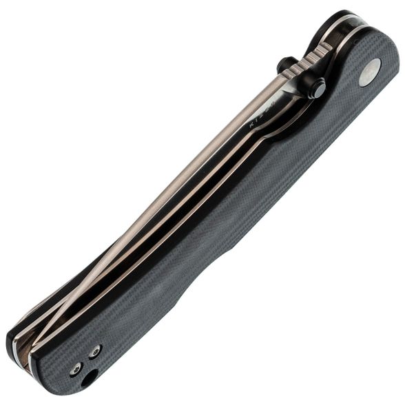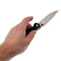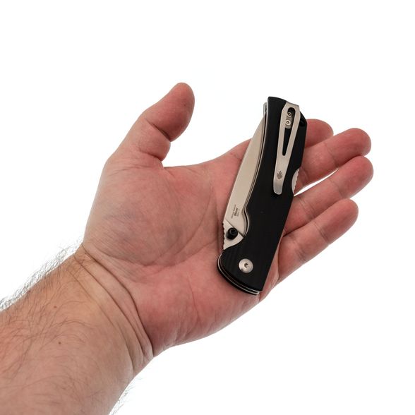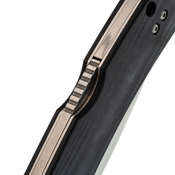 Рукоять выполнена из прочного и надёжного материала G10, устойчивого к ударам, влаге и перепадам температур, что делает её подходящей для ежедневного использования. Эргономичная форма с небольшим изгибом обеспечивает комфорт при работе. Замок Back-Lock гарантирует высокую надёжность и удобство использования обеими руками. Переставляемая клипса позволяет удобно носить нож, в том числе левшам.