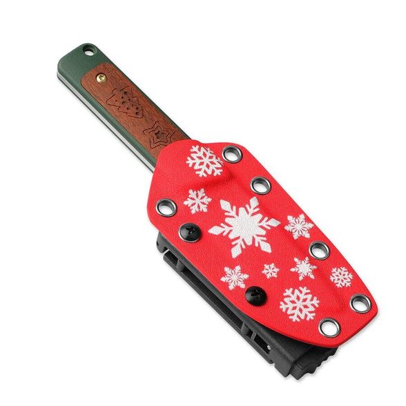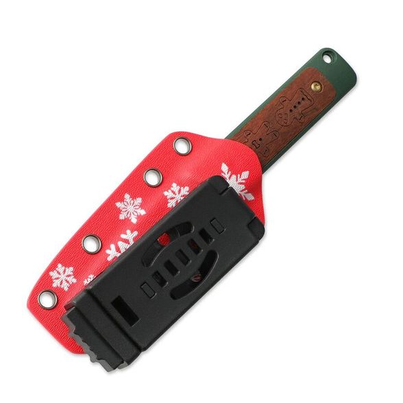 Ножны, изготовленные из кайдекса, надёжно фиксируют нож и позволяют носить его в различных положениях. Дизайн ножен также выполнен в рождественском стиле, что делает нож уникальным аксессуаром. Кроме того, в комплекте есть дополнительная пара чёрных ножен для тех, кто предпочитает более сдержанный внешний вид. Крепление типа Tek Lok позволяет удобно носить нож на ремне. А за счет особого расположения люверсов нож можно носить и на шее.