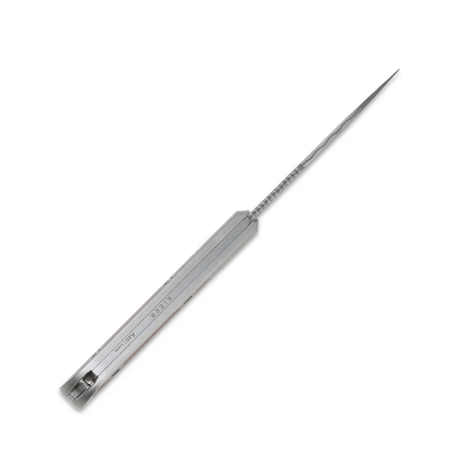 Классический Clip-Point в дамасском исполнении смотрится особенно выразительно: рисунок слоёв подчёркивает линию обуха и спусков. Высокие прямые спуски и тонкое сведение дают аккуратный рез по продуктам, верёвкам, бумаге и другим повседневным материалам. Открытие двухрукое, через ногтевые зацепы с обеих сторон - жест, который ценят любители традиционного формата складных ножей.