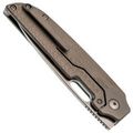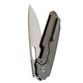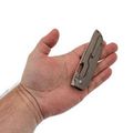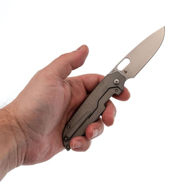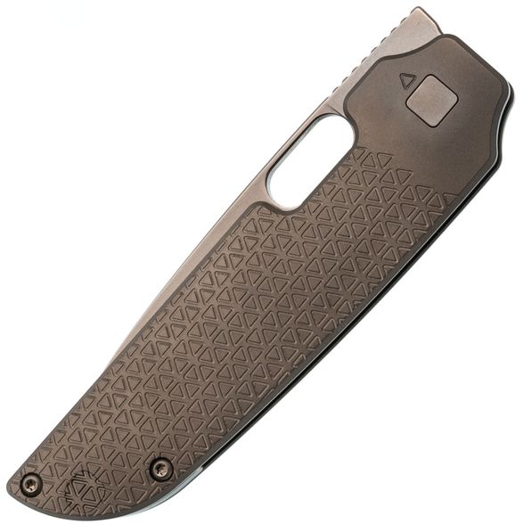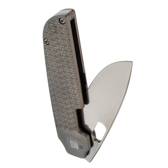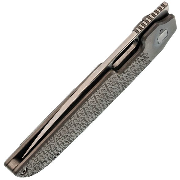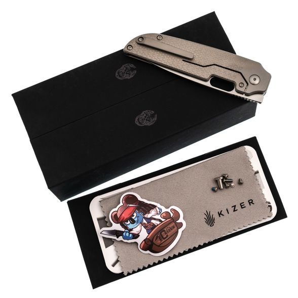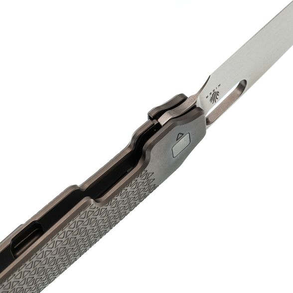 Рукоять Kizer Varatas изготовлена из прочного и легкого титана, что придает ножу не только исключительную долговечность, но и устойчивость к внешним воздействиям. Титан обладает высокой стойкостью к коррозии и износу, что делает рукоять идеальной для длительного использования. Эргономичная форма рукояти позволяет уверенно держать нож в руке, а стильная фрезеровка с множеством треугольных элементов придает инструменту привлекательный и современный вид. Замок Frame-Lock гарантирует надежность и безопасность, а титановая цельнофрезерованная клипса делает ношение ножа на кармане удобным и практичным.