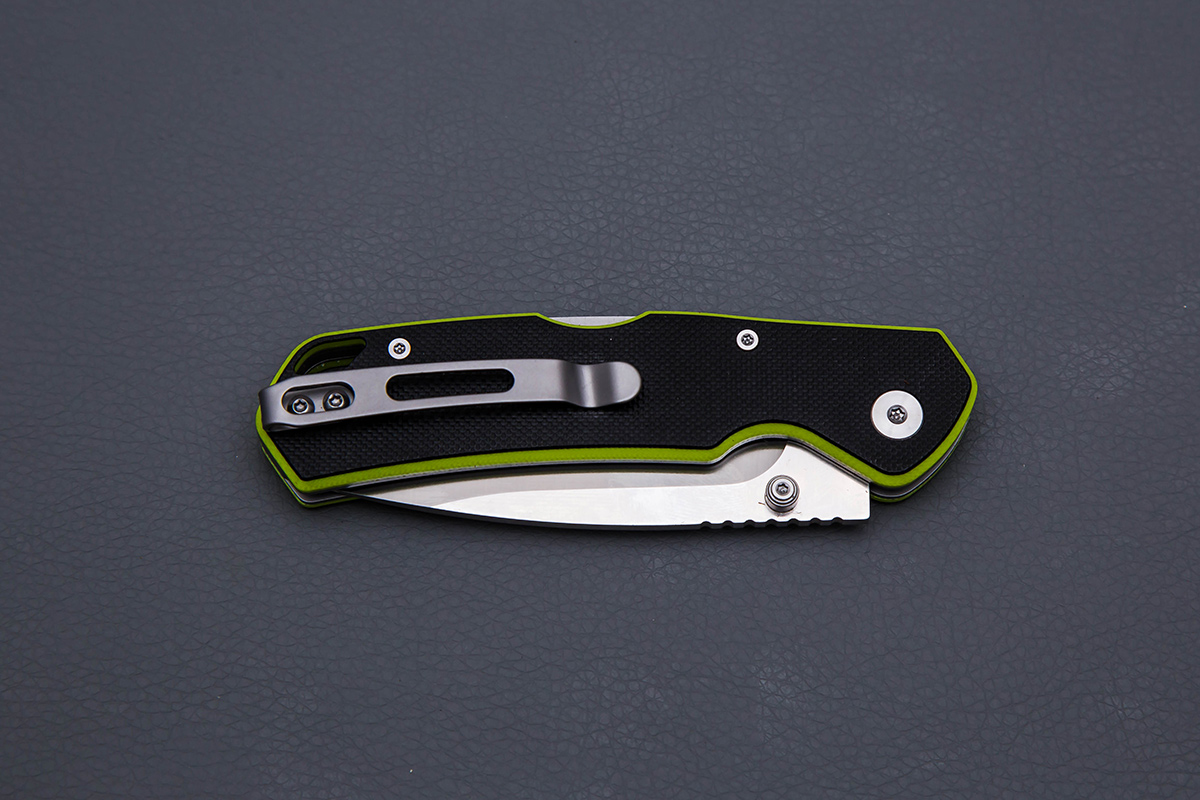 Рукоять из G10 сделана в спокойной нейтральной форме: ладонь быстро находит удобное положение, а нож не требует привыкания. Шпеньки дают более классическое открывание, без резкого флипперного щелчка. Карманная клипса помогает носить нож под рукой, а темлячное отверстие пригодится для шнура или небольшой подвески.