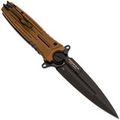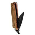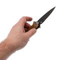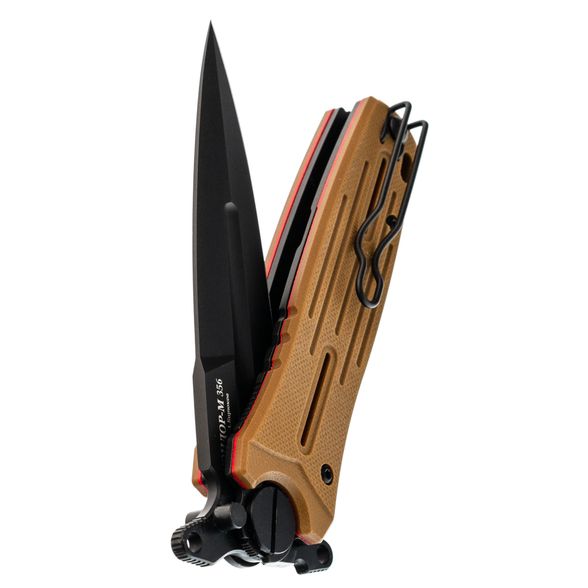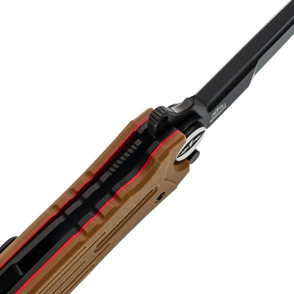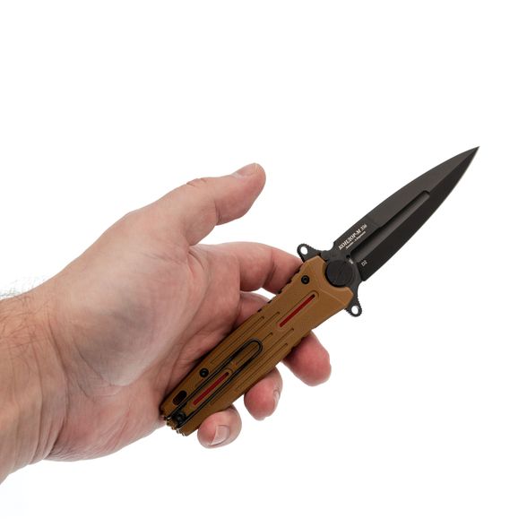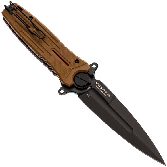Клинок выполнен из стали D2 – высококачественной инструментальной стали, обладающей превосходной износостойкостью, что позволяет существенно реже проводить заточку. Дополнительное титановое покрытие повышает коррозионную стойкость и исключает блеск, что делает клинок не только долговечным, но и эстетически привлекательным. Профиль Spear-Point обеспечивает высокую проникающую способность, а деликатный кончик позволяет выполнять аккуратные надрезы и мелкие проколы, а двухсторонние выступы у основания надежно фиксируют руку.