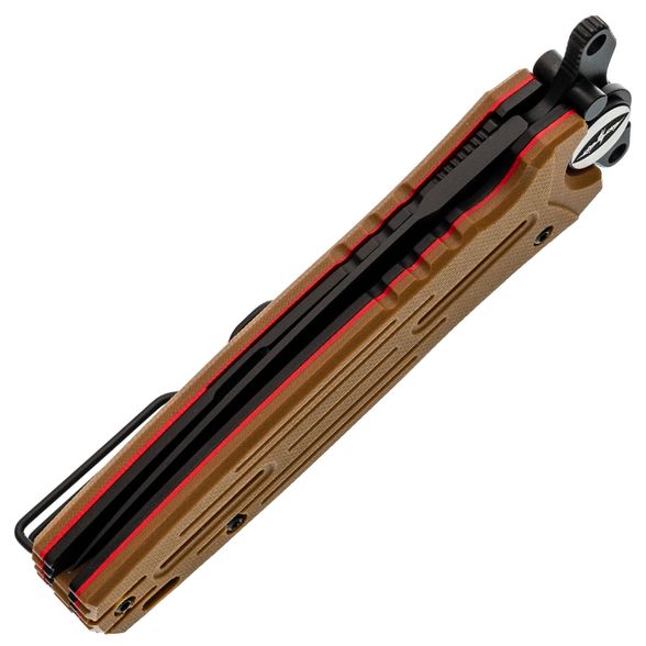 Рукоять изготовлена из прочного стеклотекстолита G10, который отличается неприхотливостью и надежностью в любых условиях. Отдельно вынесенный осевой узел с логотипом НОКС подчеркивает индивидуальность модели, а выборки на рукояти повышают цепкость, обеспечивая уверенный захват. Модель оснащена замком Liner-Lock, что гарантирует высокую безопасность использования, а темлячное отверстие и переставляемая карманная клипса добавляют функциональности.