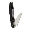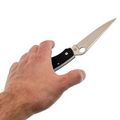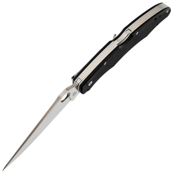 Эргономичная рукоять ножа с изогнутой формой и подпальцевыми выемками обеспечивает комфорт при любых хватах. Накладки из стеклотекстолита G10 делают нож более надежным, сохраняя его функциональность. Увеличение веса компенсируется повышенной прочностью материала, что делает этот инструмент идеальным для различных задач.