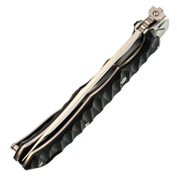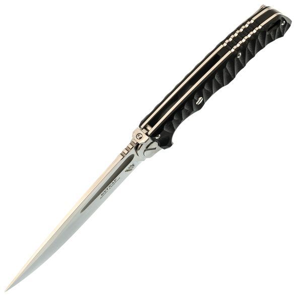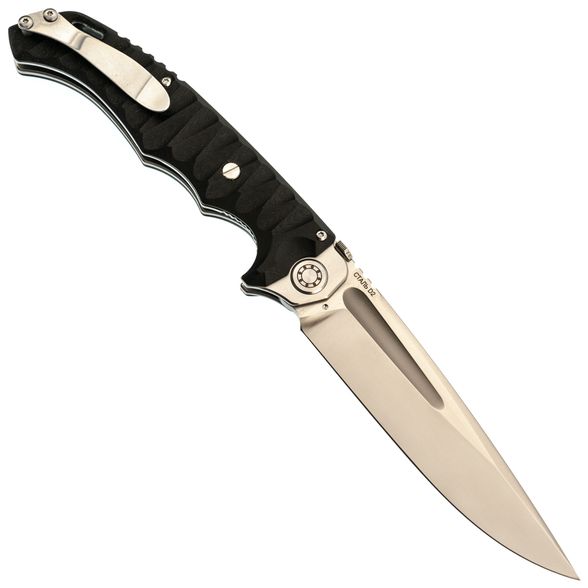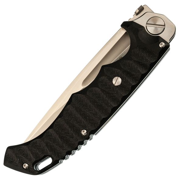 Рукоять ножа арт. 332-100406 изготавливается из черного материала G10. Он представляет собой стекловолокно, пропитанное в эпоксидной смоле. Также в продаже есть клинки зеленого и красного цветов, но версия Black привлекает больше покупателей. Половинки накладок скреплены маленькими винтами.