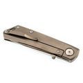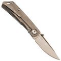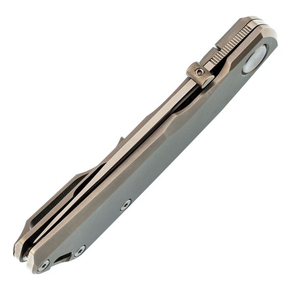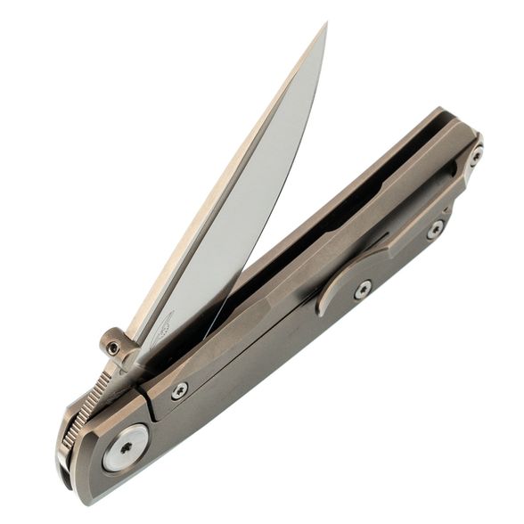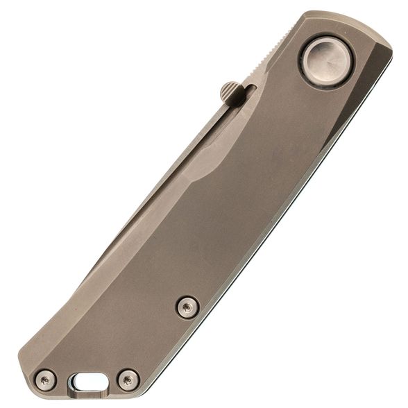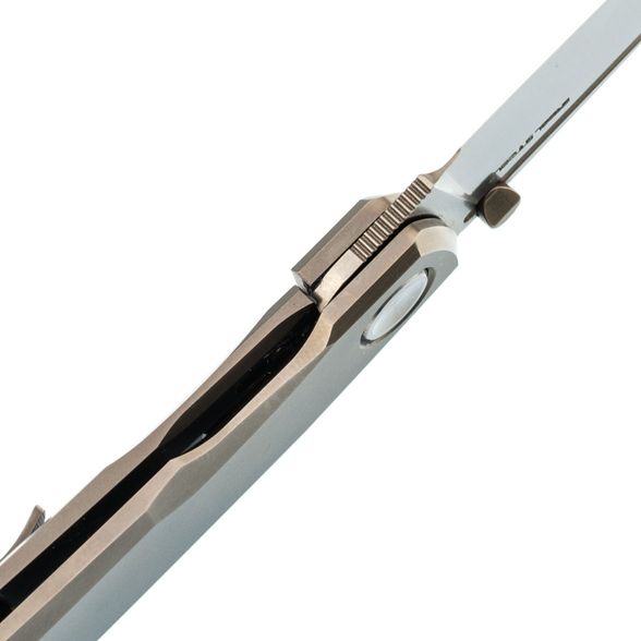 Рукоять ножа имеет несколько пухлую и изогнутую форму, за счет этого хорошо ложится в небольшие и средние руки. Выполнена она полностью из титана - металла, не сильно уступающего стали в прочности, но при этом этом гораздо более лёгкого, благодаря этому вес ножа всего 57 грамм, на кармане нож ощущаться не будет вообще.