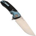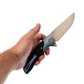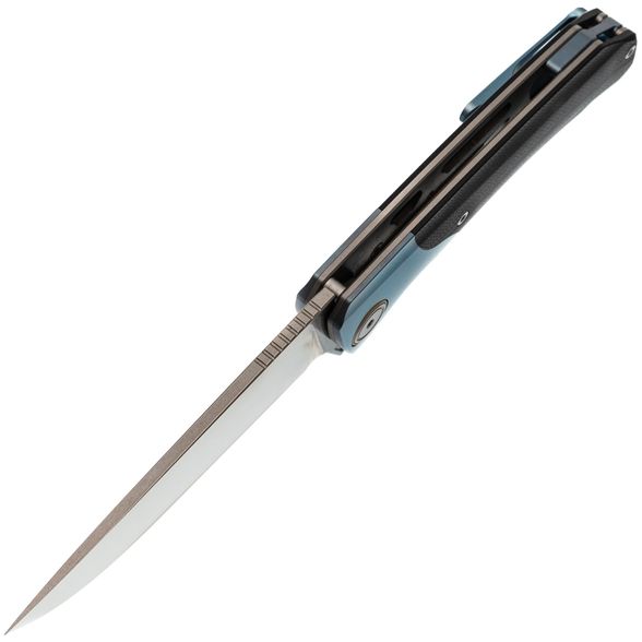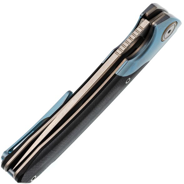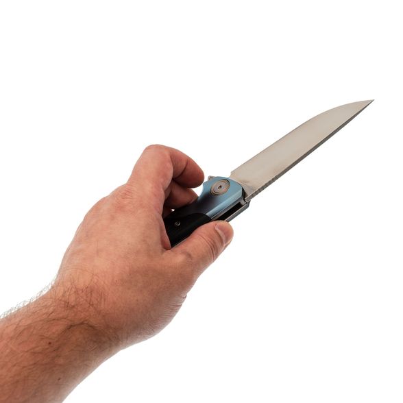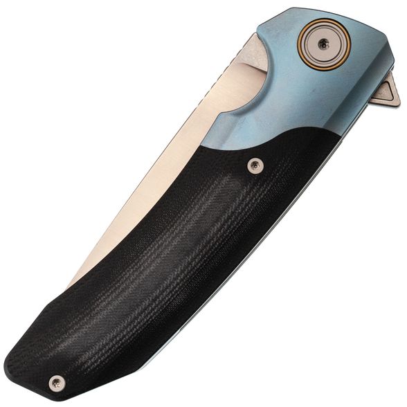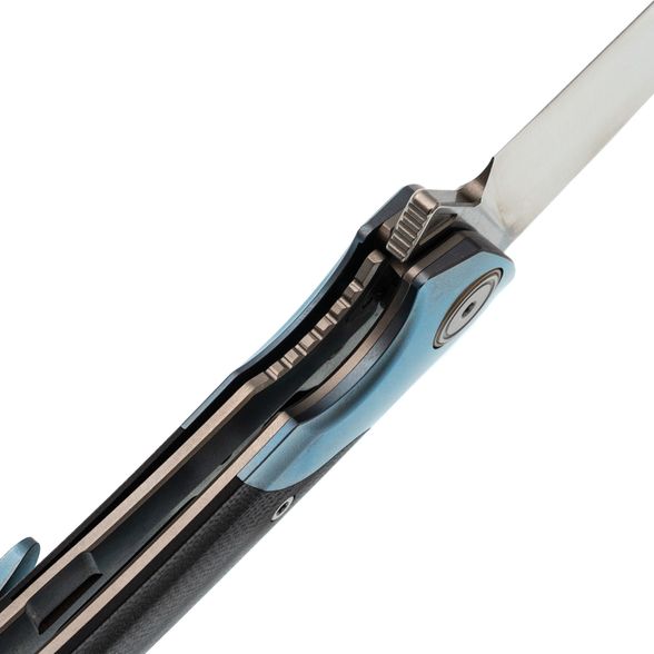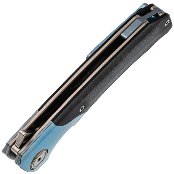 Рукоять выполнена в духе классических моделей: накладка из G10 дополнена титановым больстером, создающим приятный контраст. Изогнутая форма хорошо ложится в ладонь, а подпальцевая выемка вместе с флиппером формирует надёжный упор. В основе конструкции титановые лайнеры, что снижает общий вес. Надёжный замок Liner-Lock со стальным сухарём защищает лайнер от износа и обеспечивает долговечность фиксации.