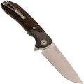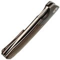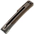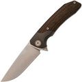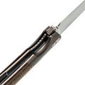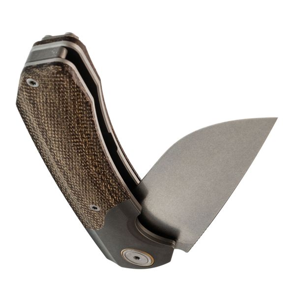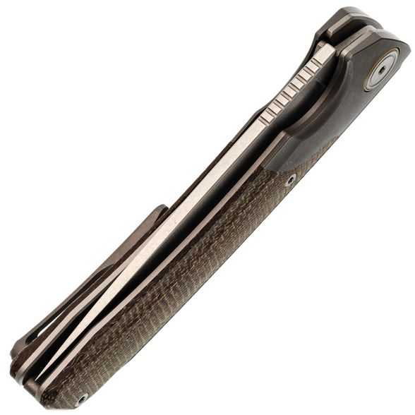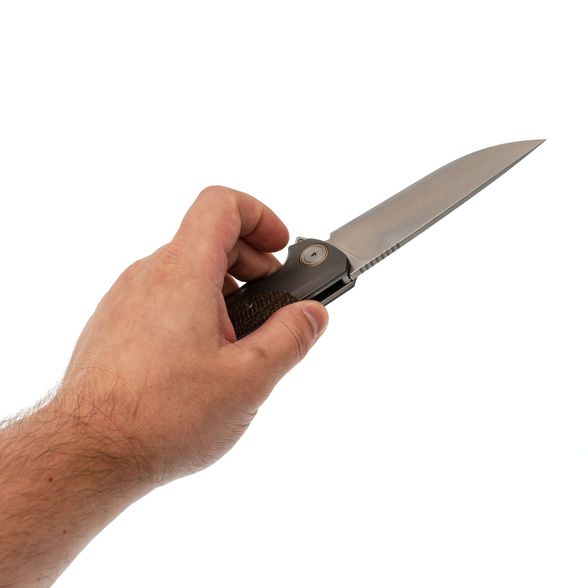 Рукоять выполнена в винтажном стиле: накладка из микарты гармонирует с титановым больстером, образуя визуально выразительный контраст. Изогнутая форма удобно ложится в руку, а подпальцевая выемка создаёт уверенный упор. Лайнеры из титана делают модель легче, а замок Liner-Lock со стальным сухарём обеспечивает надёжную фиксацию и долговечность механизма.