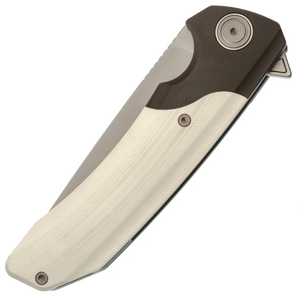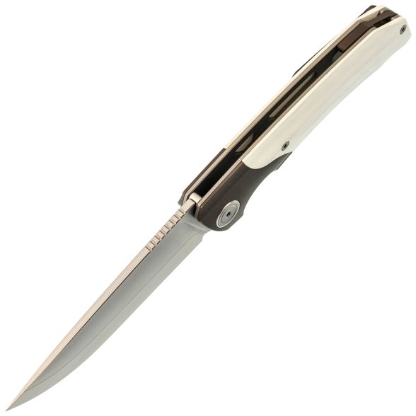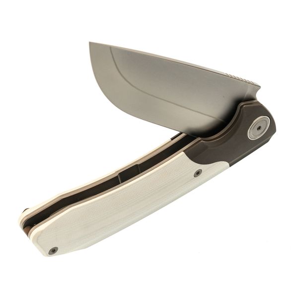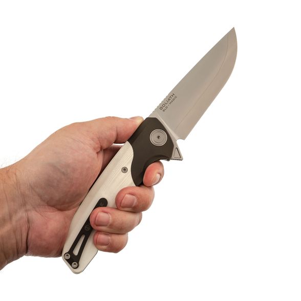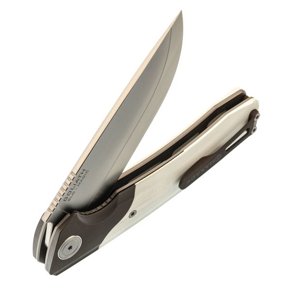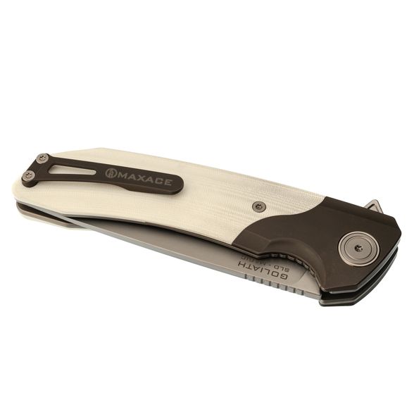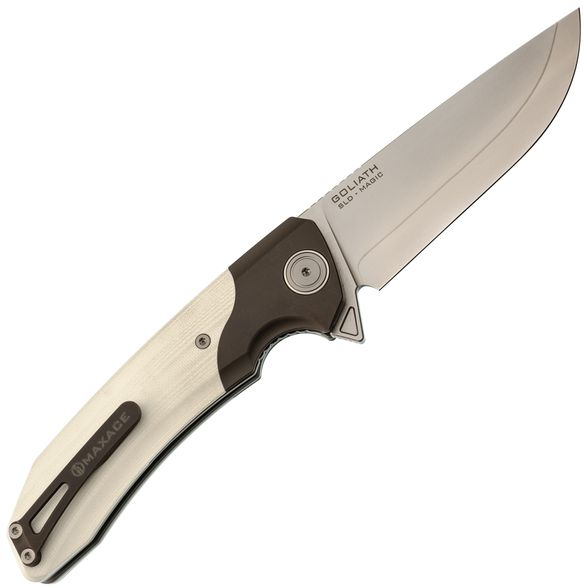 Maxace Goliath оснащен клинком из стали SLD-Magic. Эта нержавеющая сталь с содержанием хрома обеспечивает износостойкость и стойкость к коррозии, а также отличную режущую способность. Твердость стали HRC 58 гарантирует, что клинок останется острым даже после интенсивного использования. Кроме того, клинок имеет классический прямой спуск с характерным линер-локом для надежной фиксации клинка в открытом положении.