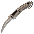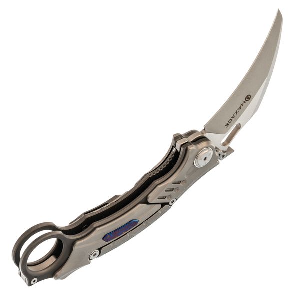 Клинок выполнен из стали CPM-Magnacut эта сталь стала трендовой в мире ножей в последние годы за счет своих отличных характеристик. Она обладает обладает высокой прочностью, очень долго держит заточку, отлично сопротивляется коррозии и агрессивно режет. По совокупности характеристик это одна из лучших сталей именно для ножей. Керамбитная форма характеризуется большим изгибом режущей кромки - преимущество такой формы в том, что при разрезании материала он не соскальзывает внутрь изгиба и не выскальзывает обратно, как было бы режущей кромке выгнутой вовне.