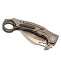 Рукоять выполнена из титана, это легкий металл, который по своей прочности не сильно уступает стали, при этом более легкий. Форма у рукояти изогнутую форму, которая удобно ложится в руку и хорошо её заполняет. Так же характерная особенность керамбитов это кольцо на навершии рукояти, которое позволяет надёжно фиксировать нож в руке обратным хватом.