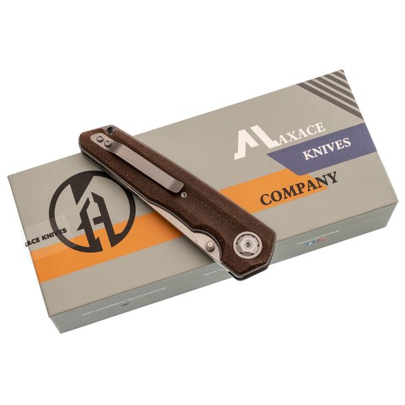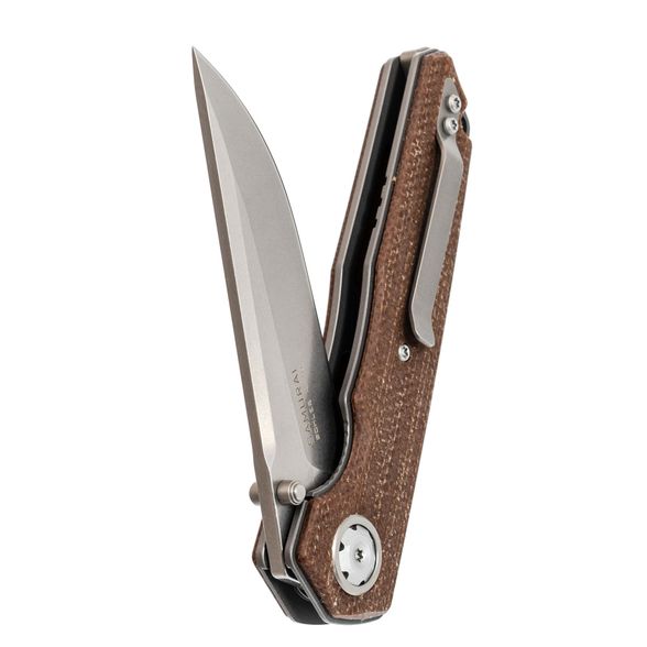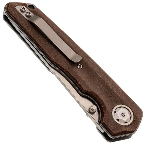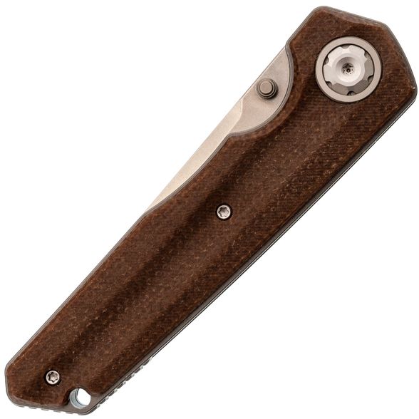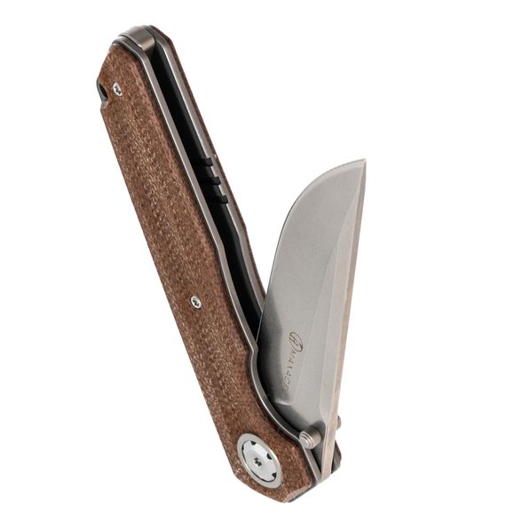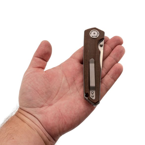 Рукоять имеет удобную пухлую форму с глубокой подпальцевой выемкой, что гарантирует надежное и комфортное удержание в руке. Толстые лайнеры образуют дополнительную прочность конструкции, делая модель еще более надежной и устойчивой к износу. Коричневые накладки из микарты схожи с древесиной, что придаёт модели слегка традиционный внешний вид.
