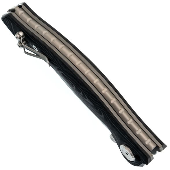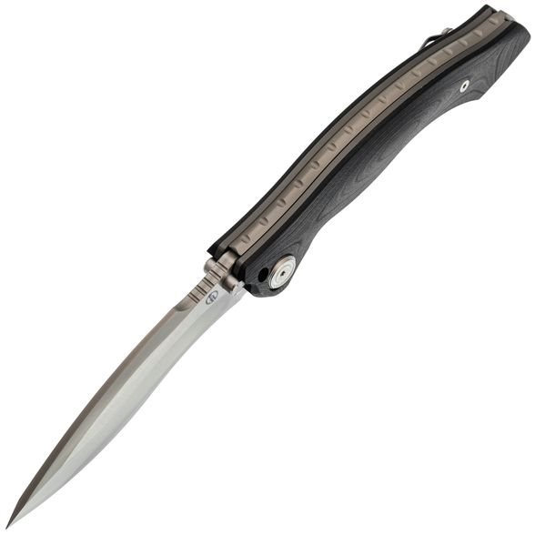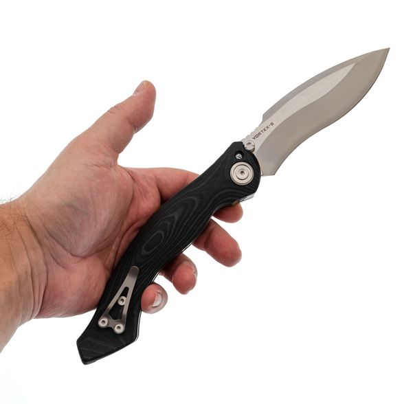 Maxace Vortex-S — это большой складной нож с ломовым дизайном и внушительными размерами. Клинок изготовлен из стали SLD-Magic, аналогичной по свойствам D2, но с ламинатной конструкцией, что позволяет достичь большей твердости и коррозионной стойкости. Форма Kukri обеспечивает отличную рубящую способность за счет смещения баланса в сторону кончика. Рукоять с изгибом удобна для разных хватов, а накладки из микарты устойчивы к воде и ударам. Лайнеры толщиной 3 мм делают его очень надёжным. Особенность модели — стопорный пин, превращающий его в фиксированный что исключает возможность его складывания при тяжелых нагрузках. В комплект входят запасные части и аксессуары.