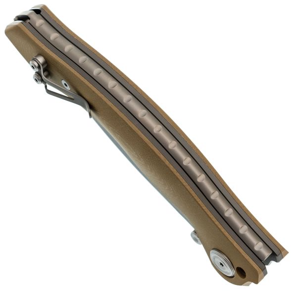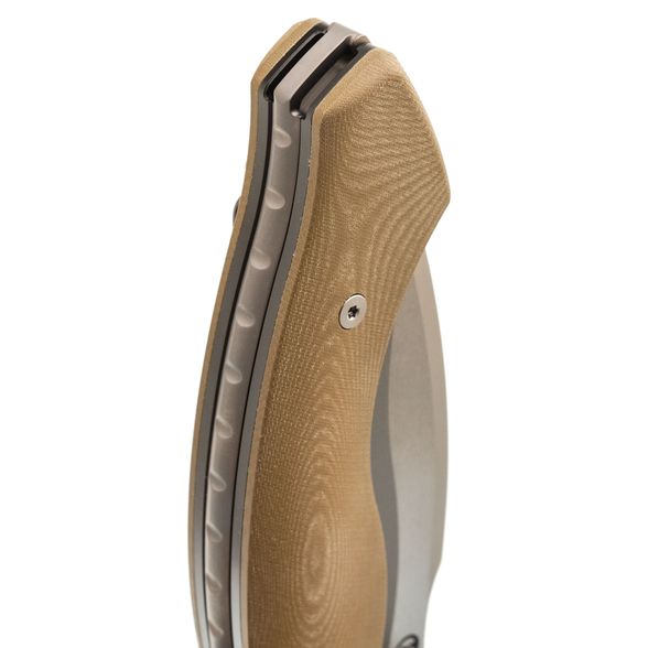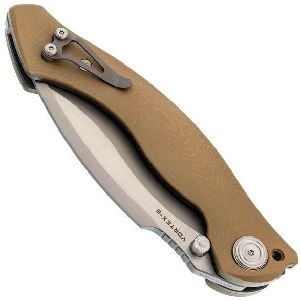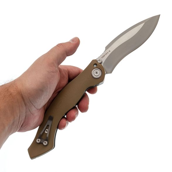Рукоять Vortex-S имеет изогнутую форму, удобную для различных хватов. Накладки выполнены из микарты - материала с бархатистой текстурой, устойчивого к воздействию воды и ударов. Лайнеры ножа с толщиной 3 мм обеспечивают отличную надёжность и прочность ножа.