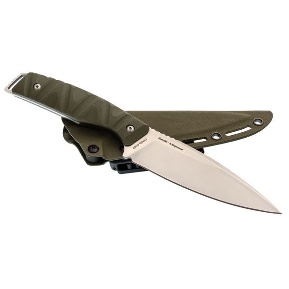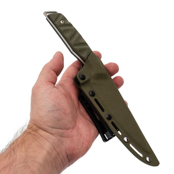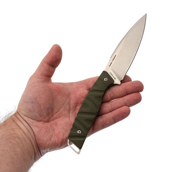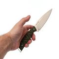 Рукоять ножа имеет удобную изогнутую форму с выраженной выемкой под пальцы, что обеспечивает уверенный и безопасный хват. Конструкция с накладным монтажом гарантирует прочность и удобство обслуживания. Накладки из стеклотекстолита G10 обладают высокой прочностью, легкостью и устойчивостью к внешним воздействиям, а их текстурированная поверхность улучшает сцепление.