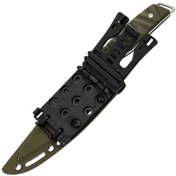 Ножны изготовлены из кайдекса, что делает их прочными и устойчивыми к любым погодным условиям. Они надежно фиксируют нож, предотвращая его выпадение. В комплект входит крепление типа Tek Lok, которое позволяет удобно носить нож на ремне.