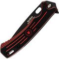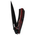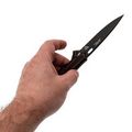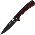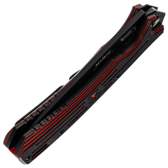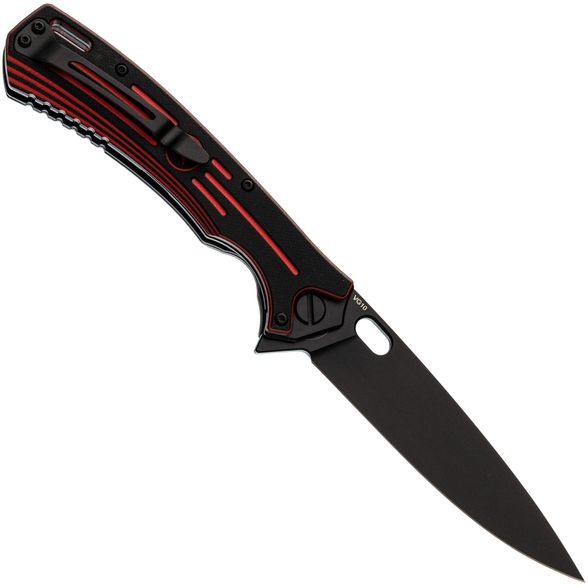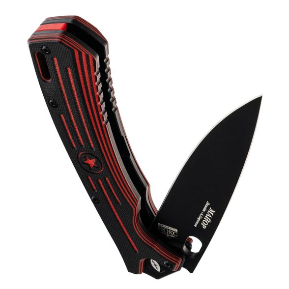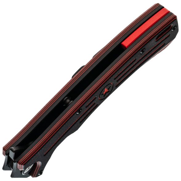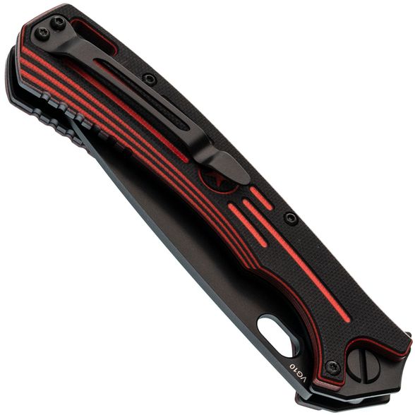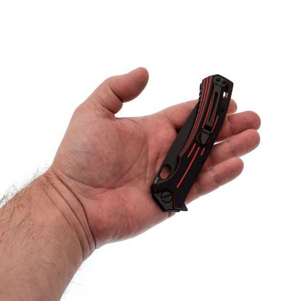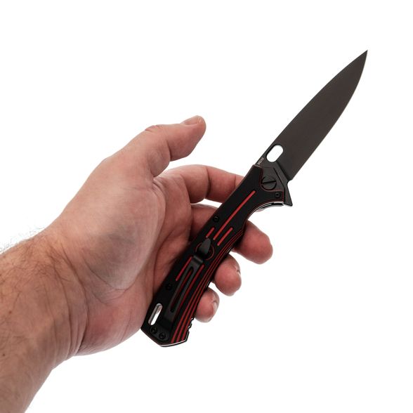 Рукоять изготовлена из материала G10 – легкого, устойчивого к влаге и изменениям цвета стеклотекстолита, который не впитывает запахи. Форма рукояти с лёгким изгибом и крупной подпальцевой выемкой, усиленной плавником, обеспечивает удобное и безопасное удержание. Фиксация клинка осуществляется замком Liner-Lock, удерживающим его в открытом состоянии. Дополнительно предусмотрены карманная клипса и темлячное отверстие для ношения и возможности установки аксессуаров.