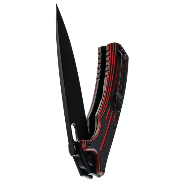 Клинок выполнен из стали VG-10, обеспечивающей стабильную работу в любых условиях. Его профиль Drop-Point позволяет выполнять задачи от нарезки продуктов до вскрытия упаковок, а прямые спуски от обуха способствуют равномерному распределению нагрузки при резке и строгании. Механизм открытия реализован через отверстие в клинке и плавник. Обработка по технологии Stonewash скрывает мелкие следы эксплуатации.