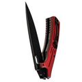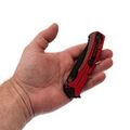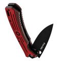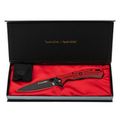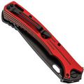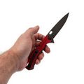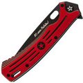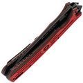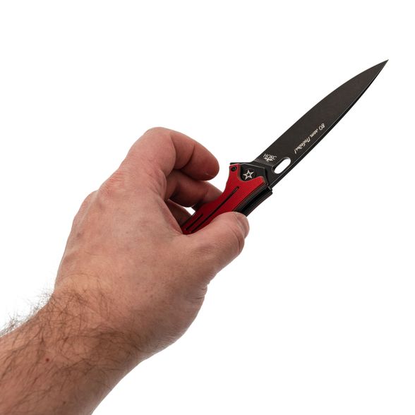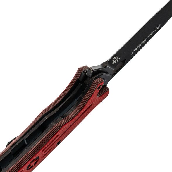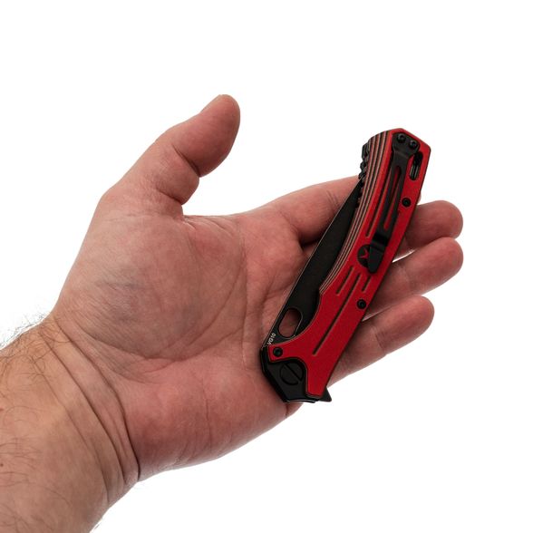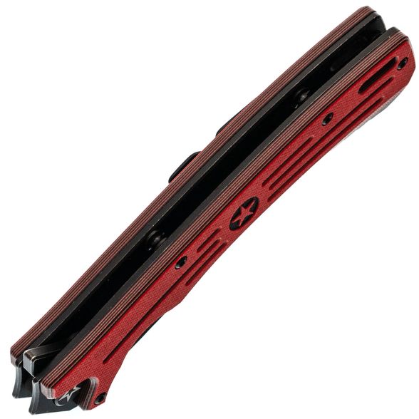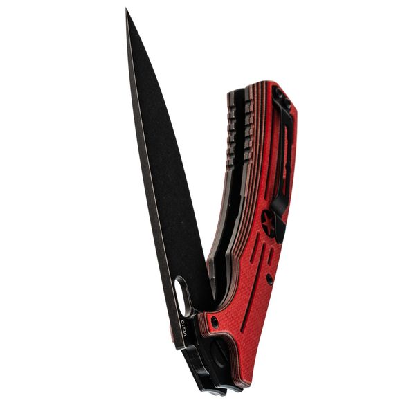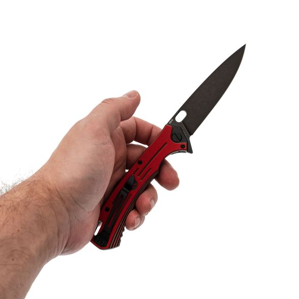 Рукоять выполнена из материала G10 с многослойной структурой, что обеспечивает дополнительную прочность и долговечность. Изделие отличается ярким красным цветом рукояти, который гармонично сочетается с общим дизайном ножа. Эргономичная форма с глубокой подпальцевой выемкой гарантирует удобное и безопасное использование в любых условиях. Механизм фиксации клинка реализован через замок Liner-Lock, надежно удерживающий клинок в открытом положении.