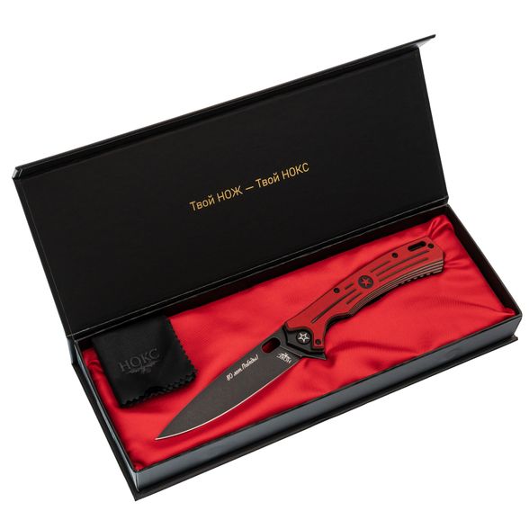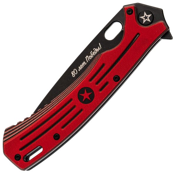 Клинок изготовлен из стали VG-10, известной своей долговечностью и стабильностью при различных эксплуатационных нагрузках. Профиль Drop-Point с прямыми спусками от обуха обеспечивает равномерное распределение усилий при резке и строгании. Открытие клинка осуществляется посредством отверстия и плавника. Поверхность обработана технологией Black Stonewash, повышающей коррозионную стойкость и устраняющей блики, а также дополнена специальной гравировкой, поздравляющей с 80-летней годовщиной Победы.