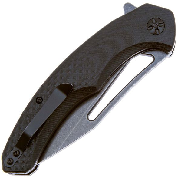 Рукоять ножа имеет эргономичную форму с большим изгибом, благодаря чему он удобно лежит в руке. Накладки выполнены из стеклотекстолита G10, известного своей прочностью и неприхотливостью в уходе. Ближе к навершию рукояти имеется текстура в виде звезд, которая не только выглядит впечатляюще, но и обеспечивает дополнительное сцепление, повышая безопасность и комфорт при использовании ножа.
