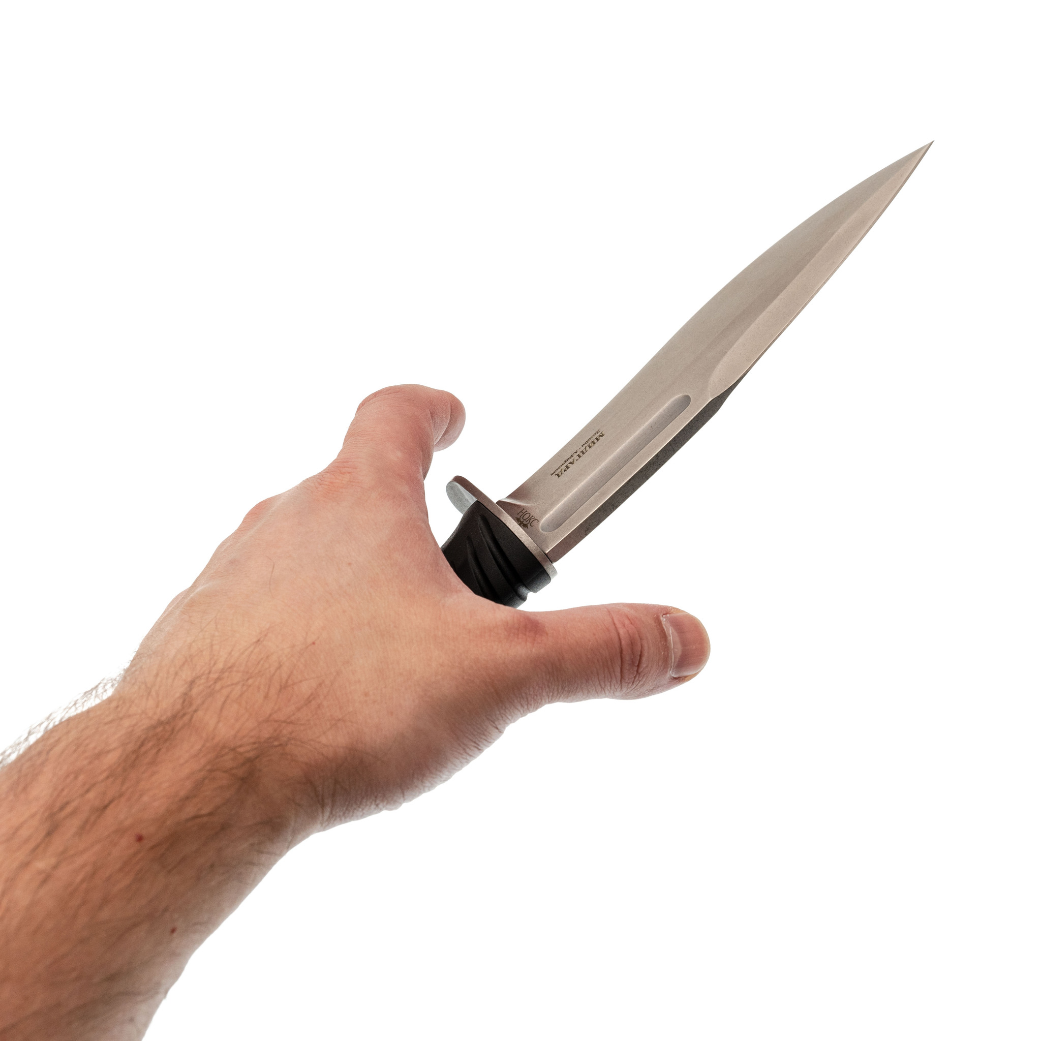 Рукоять этого ножа имеет скругленную форму, что делает его удобным для использования на протяжении долгого времени. Эластромерный материал гарантирует надежный захват даже в самых влажных условиях, позволяя работать с инструментом без риска его выскальзывания.