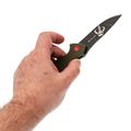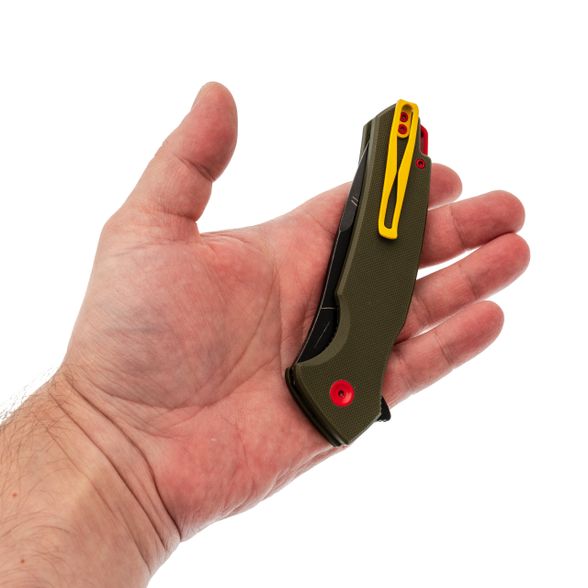 Перед нами классический Drop-Point - опущенное остриё даёт прочный кончик, который не сломается, если поддеть что-то жёсткое. Длина клинка достаточная, чтобы нарезать продукты для перекуса или застрогать палочку для костра. Высокие прямые спуски делают нож настоящим резаком: тонкая подводка легко входит в материал, и резать приятно, без лишних усилий. Открывается нож за флиппер - движение кистью, и клинок вылетает плавно, без затыков. Управляться можно любой рукой, хоть правой, хоть левой.