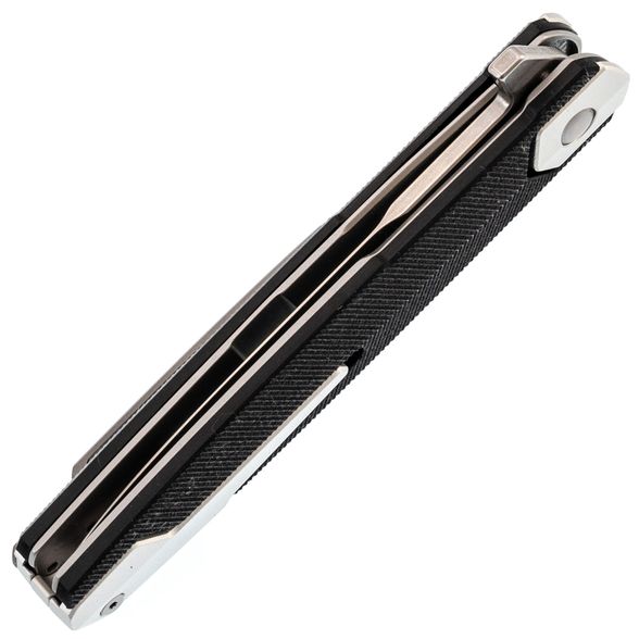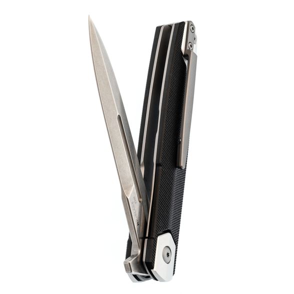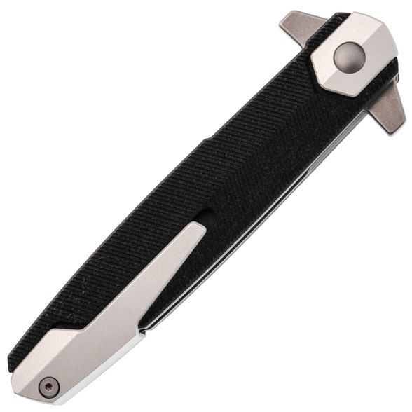 Рукояти выполнены из стеклотекстолита G10. Этот материал известен своей прочностью и неприхотливостью. Его поверхность устойчива к воздействию внешних факторов, а также приятна на ощупь, что обеспечивает дополнительный комфорт в использовании. Прямые линии и острые углы рукояти ассоциируются с эстетикой космоса, однако их геометрия ничуть не умаляет удобства — нож комфортно лежит в руке, не причиняя дискомфорта.