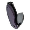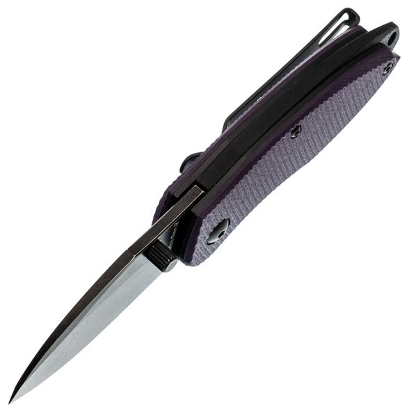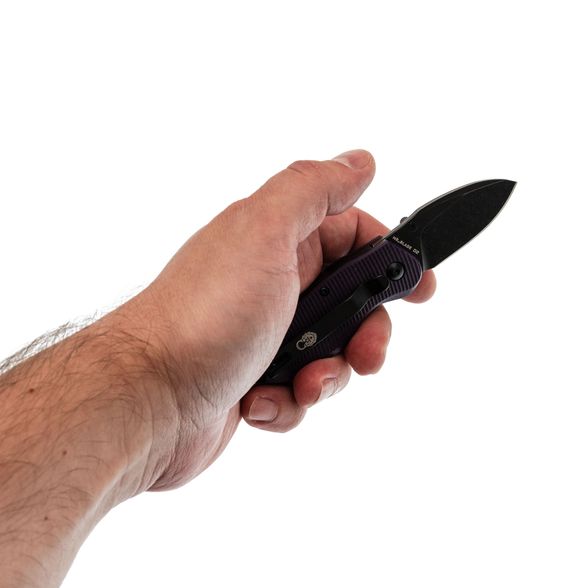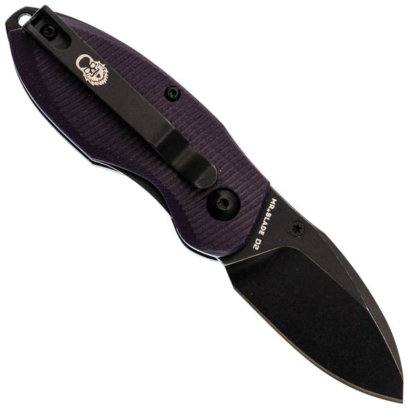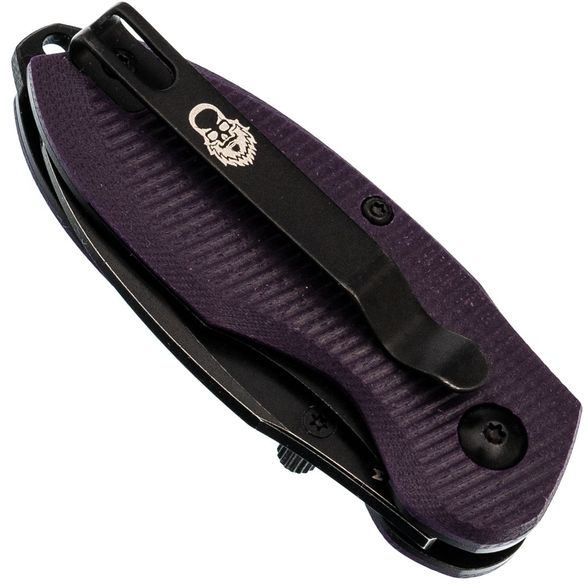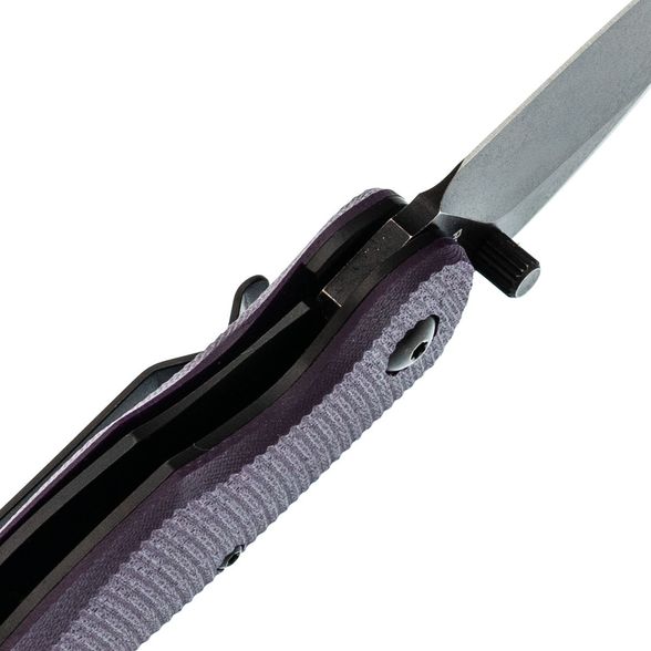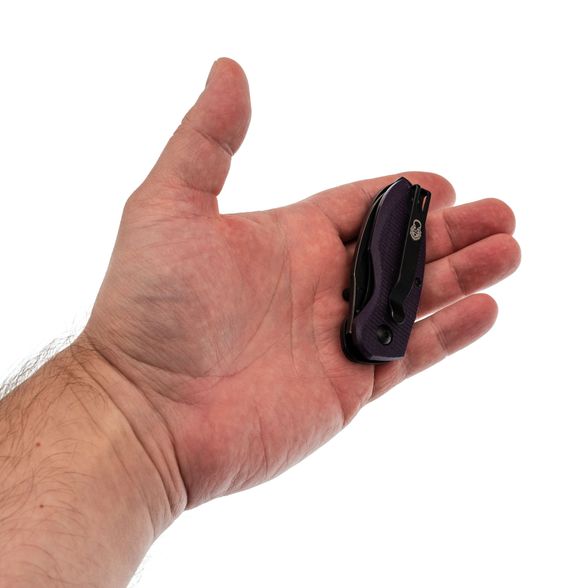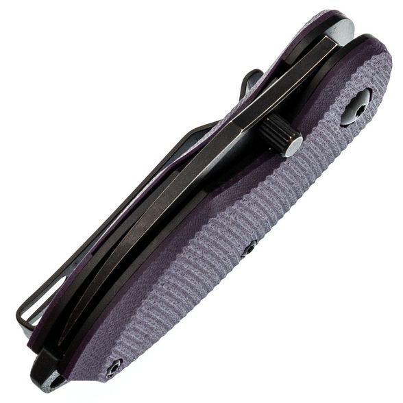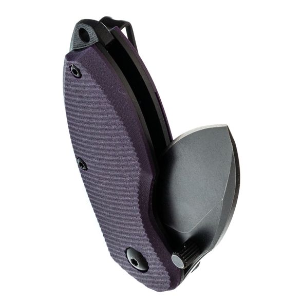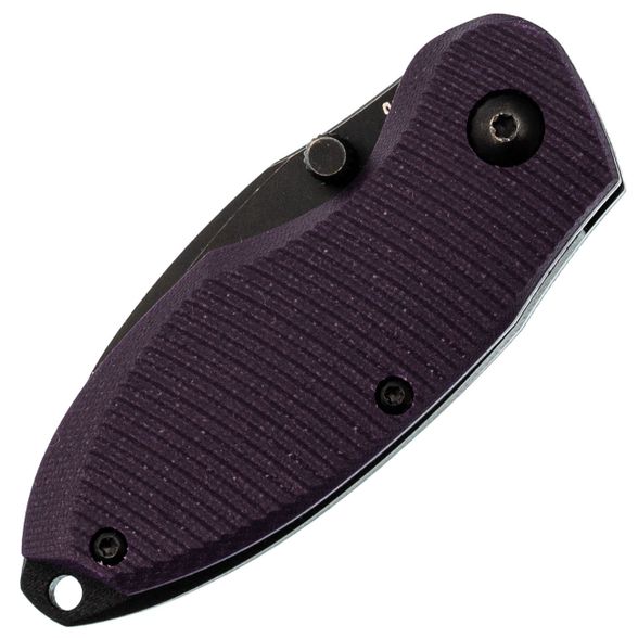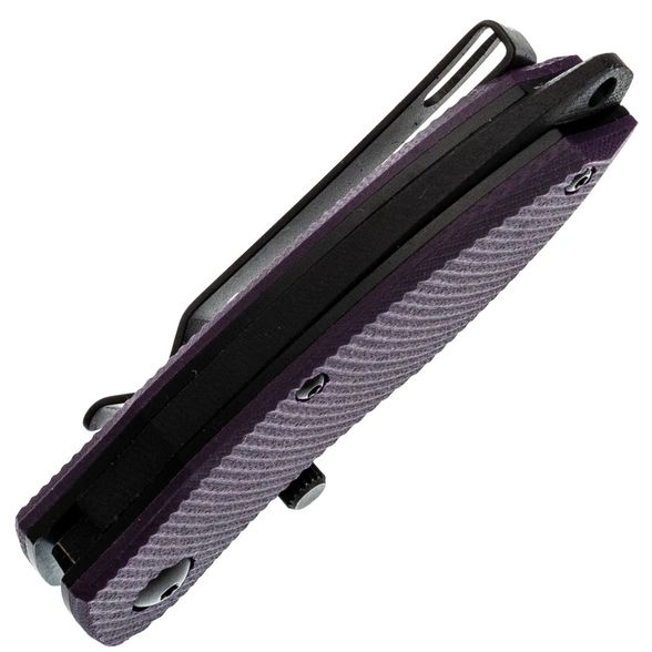 Рукоять из G10. Прочный композит G10, окрашенный в насыщенный фиолетовый цвет, выделяет нож на фоне классических моделей. Материал устойчив к воздействию влаги, температур и химикатов, а сам цвет остаётся ярким и не тускнеет со временем. Сочетание с чёрным клинком выглядит современно и динамично.