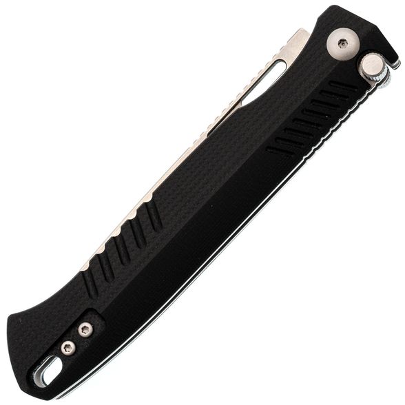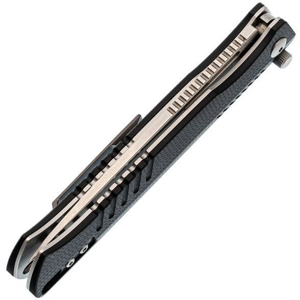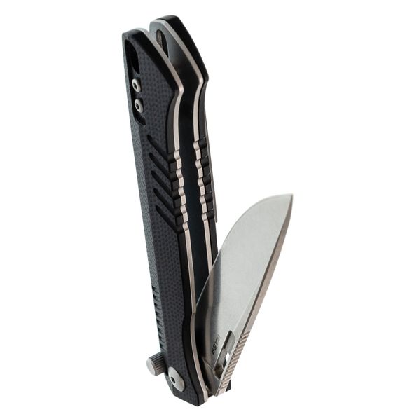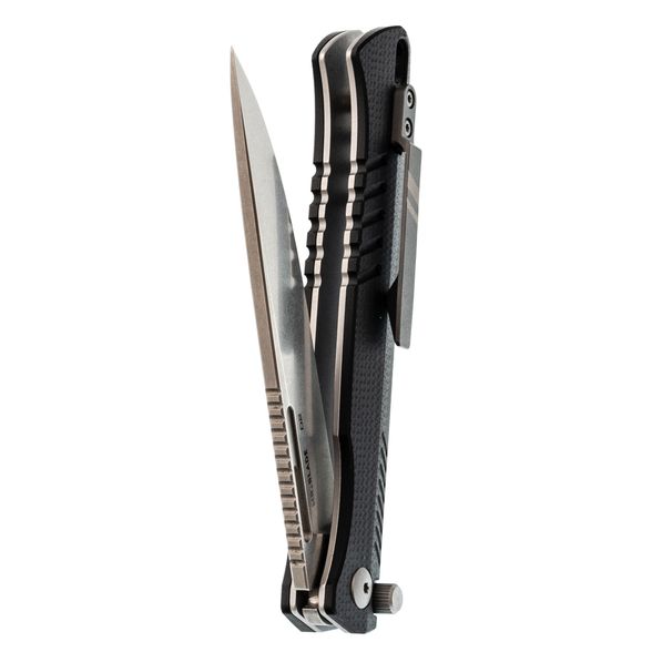 Рукоять из G10. Многослойный стеклотекстолит, обработанный фрезеровкой для лучшего сцепления с ладонью. G10 устойчив к механическим воздействиям и температурным перепадам.