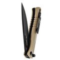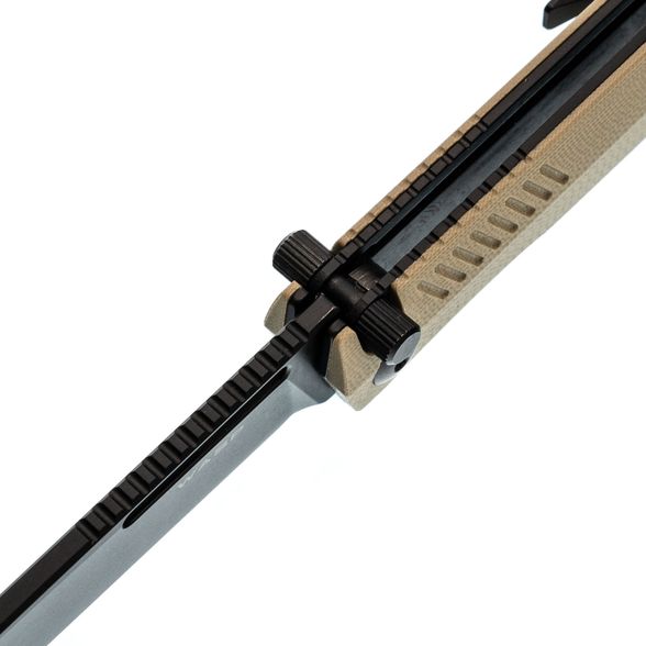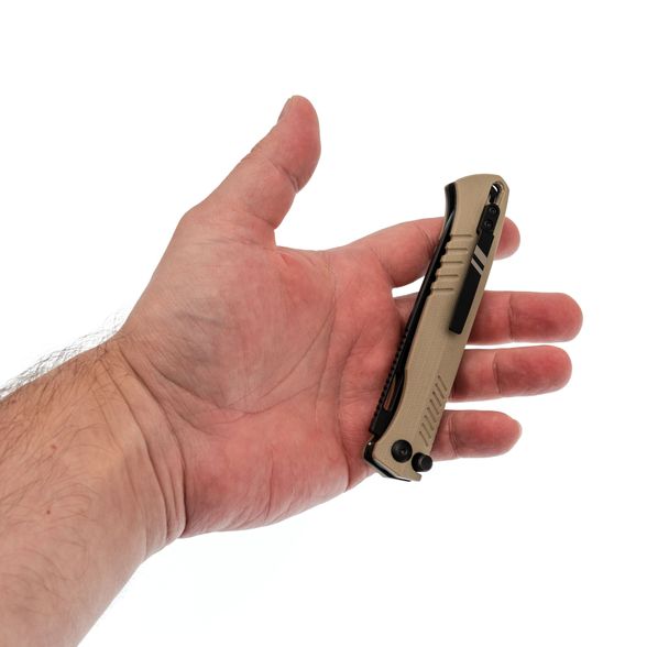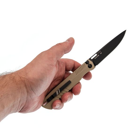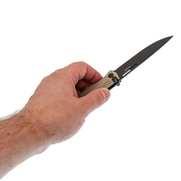 Клинок узкий, с профилем Drop-Point - классическим решением для универсального применения. Благодаря прямым высоким спускам он хорошо справляется как с точными резами, так и с грубой работой. Отверстие в клинке обеспечивает уверенное открытие, а инерционная механика делает процесс ещё быстрее. Клинок легко справляется с большинством бытовых и походных задач без потери остроты.