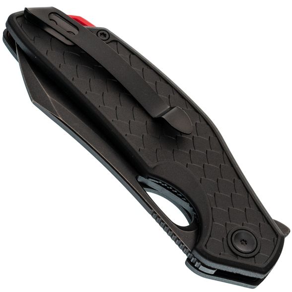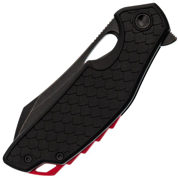 Рукоять выполнена из FRN – прочного и лёгкого термопластика, который не боится воды и перепадов температур, что позволяет использовать нож в любых условиях. Текстура накладок, имитирующая чешую, создаёт надёжный хват и придаёт стиль. Бекспейсер, оформленный в виде горба с темлячным отверстием, подчёркивает концептуальный дизайн. Нож оснащён замком Liner-Lock, который обеспечивает безопасное фиксирование, а карманная клипса, напоминающая хвост, делает его удобным для ежедневного ношения.