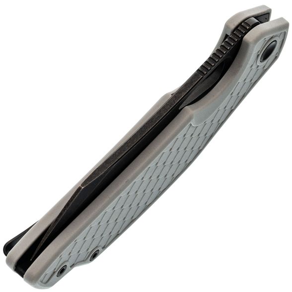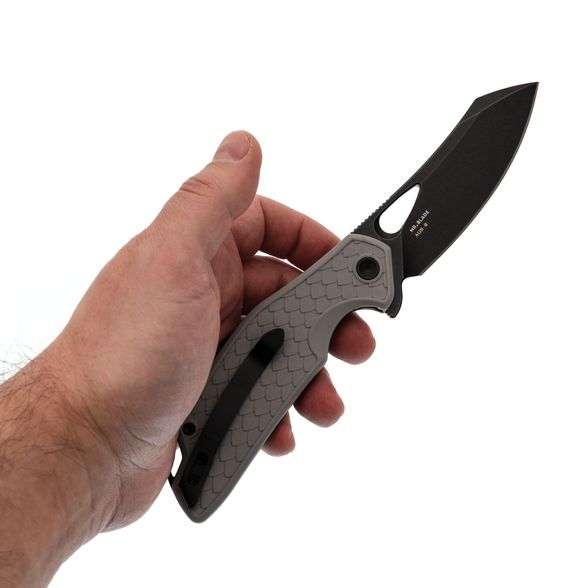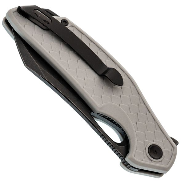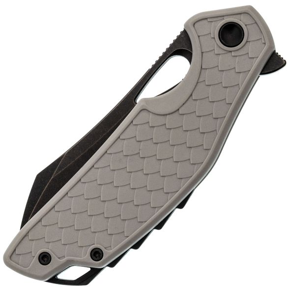 Рукоять изготовлена из FRN – надёжного термопластика, устойчивого к влаге и резким температурным изменениям, что позволяет использовать нож в любых условиях. Накладки с текстурой, имитирующей чешую, создают уверенный хват и стильный внешний вид. Бекспейсер, имитирующий горб с темлячным отверстием, добавляет модели оригинальности. Замок Liner-Lock надёжно фиксирует лезвие, а карманная клипса, напоминающая хвост, обеспечивает удобство при повседневном ношении.
