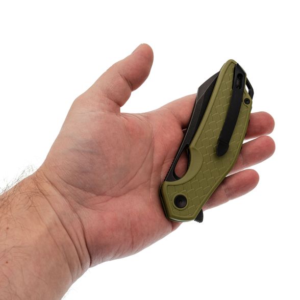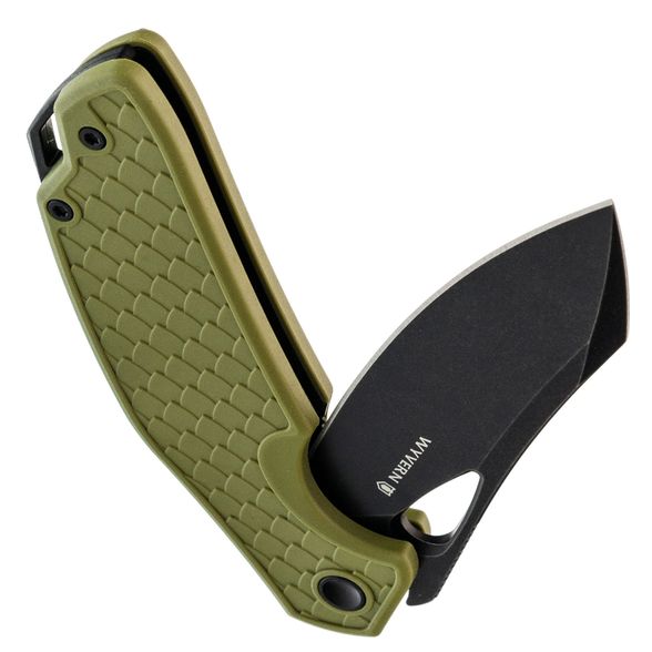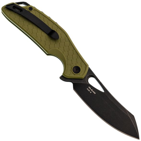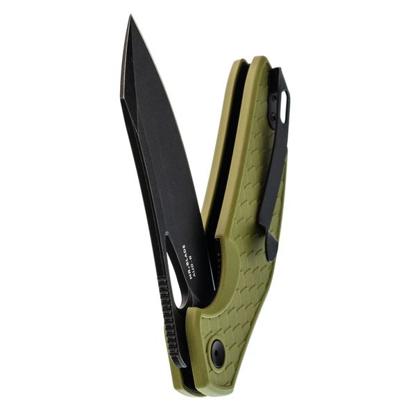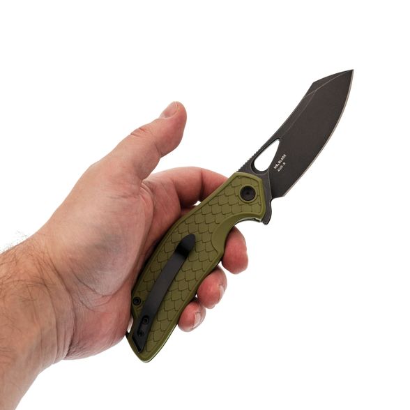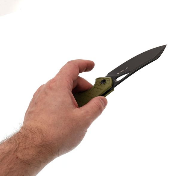 Клинок изготовлен из стали AUS-8, которая славится превосходной коррозионной стойкостью, высокой ударной вязкостью и лёгкостью заточки, что делает её идеальной для активного использования. Нож имеет профиль модифицированного Wharncliffe, который особенно удобен при работе кончиком и строгании. Открытие лезвия возможно как с помощью флиппера, так и через отверстие в клинке. Высокие прямые спуски способствуют отличному резу, а подшипники в осевом узле обеспечивают быстрое и плавное открывание.