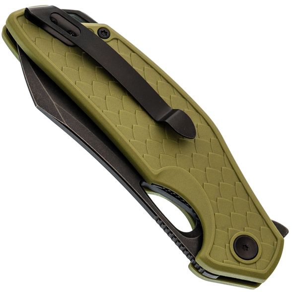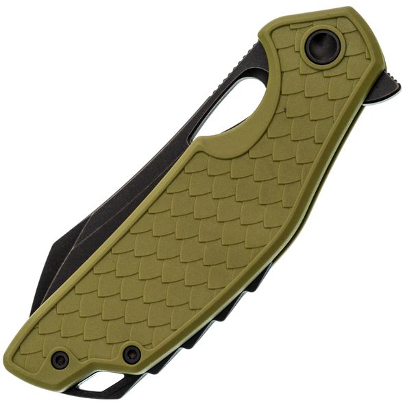Рукоять выполнена из FRN – прочного термопластика, легкого и устойчивого к воздействию влаги и температурных перепадов, что позволяет использовать нож в любых условиях. Текстурированные накладки, имитирующие чешую, добавляют удобство хвата и стиль. Бекспейсер, выполненный в форме горба с темлячным отверстием, придаёт модели особый характер. Замок Liner-Lock обеспечивает надёжное закрытие лезвия, а карманная клипса, напоминающая хвост, делает нож удобным для повседневного ношения.
