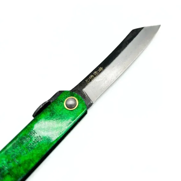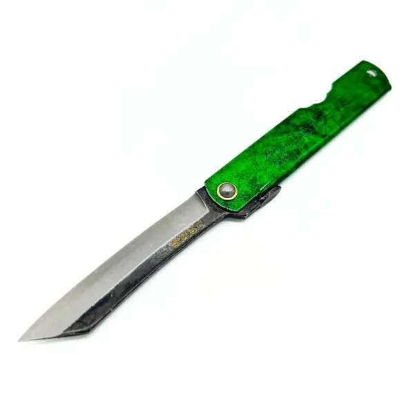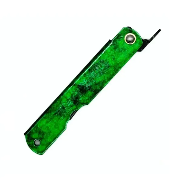 Название Hisui отсылает к жадеиту: спокойный чёрно-зелёный рисунок на металле делает нож узнаваемым и аккуратно маскирует возможные следы эксплуатации. Визуально он ближе к традиционным японским вещам, чем к техничным тактическим карманным ножам.