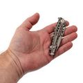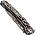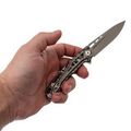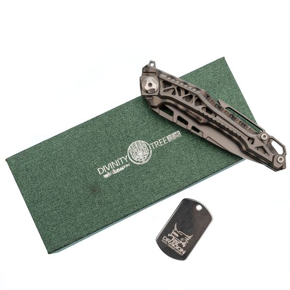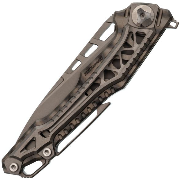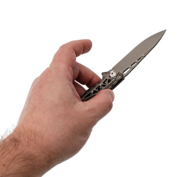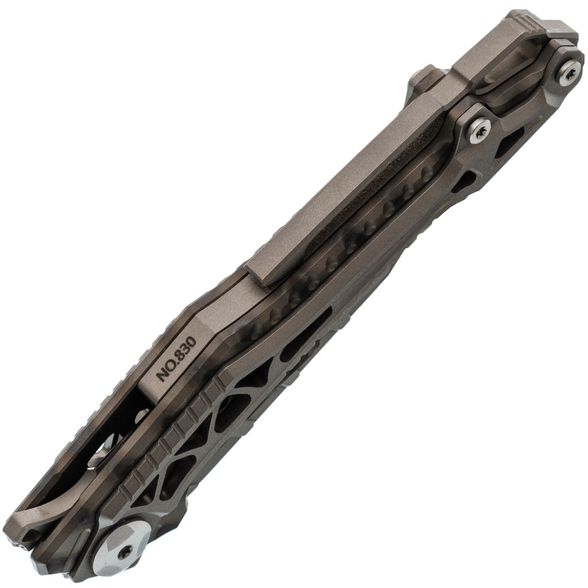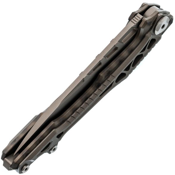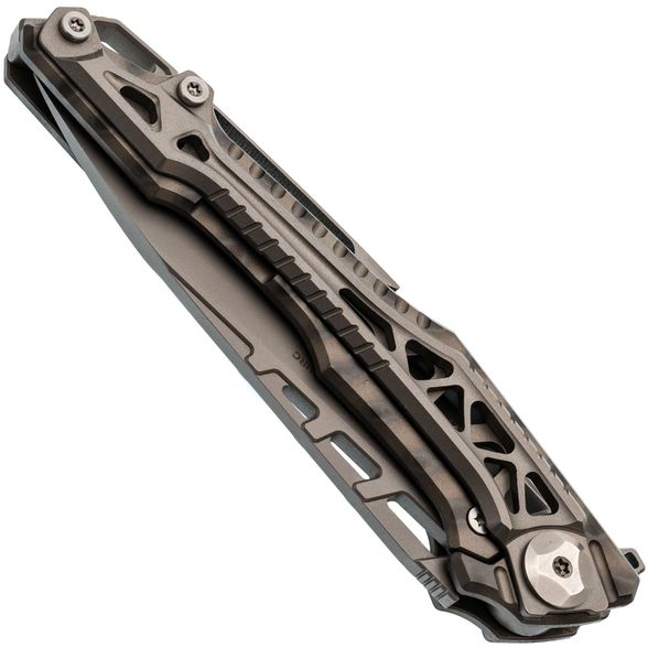 Рукоять выполнена из титана и украшена узором Tiger Stripe Pattern — редким и необычным декоративным элементом, производство которого требует значительных затрат. Такой узор не только делает дизайн более выразительным, но и подчёркивает эксклюзивность модели. Рукоять имеет титановую накладку, анодированную в контрастный цвет, что добавляет эстетической сложности и индивидуальности. Нож оснащён замком Frame-Lock, обеспечивающим высокую прочность и надёжность, необходимых для ежедневного использования. Титановая клипса, расположенная на спинке рукояти, делает ношение ножа в кармане брюк максимально удобным.