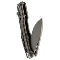 Клинок изготовлен из стали M390 — высококачественного порошкового сплава, известного своей коррозионной стойкостью, твёрдостью и длительным удержанием заточки. Прямые спуски от обуха обеспечивают отличные режущие свойства, делая нож удобным для различных задач. В клинке предусмотрены отверстия для открывания, что добавляет вариативности в использовании и подчёркивает внимание к деталям в конструкции.