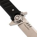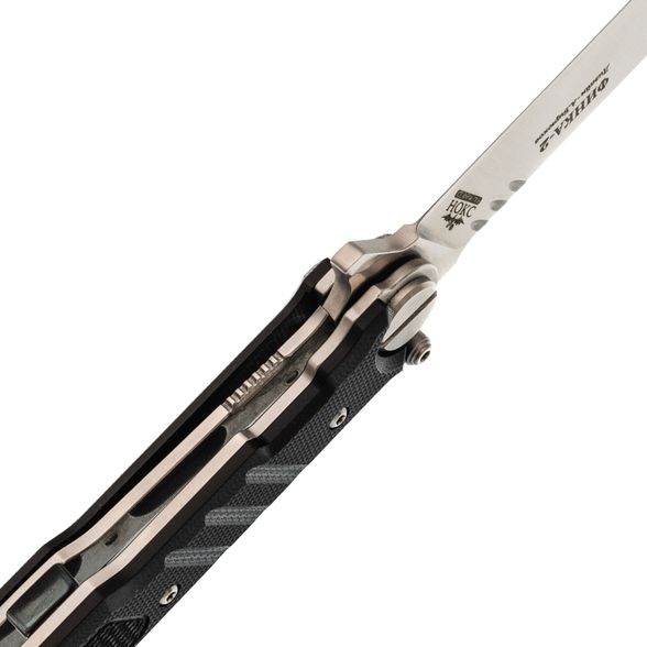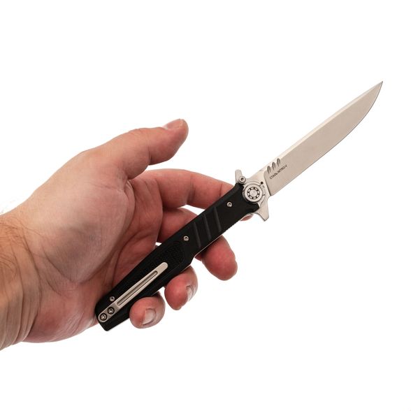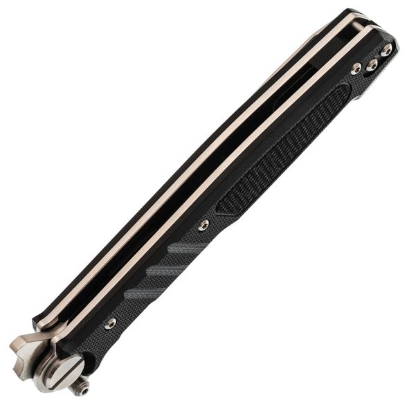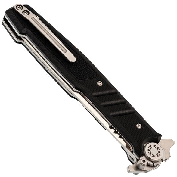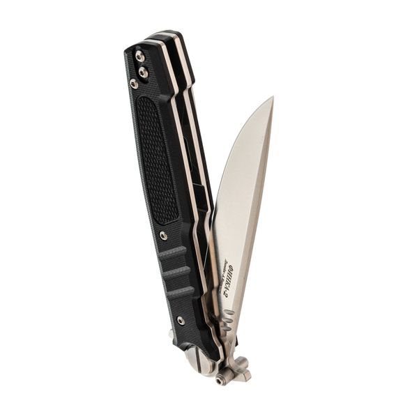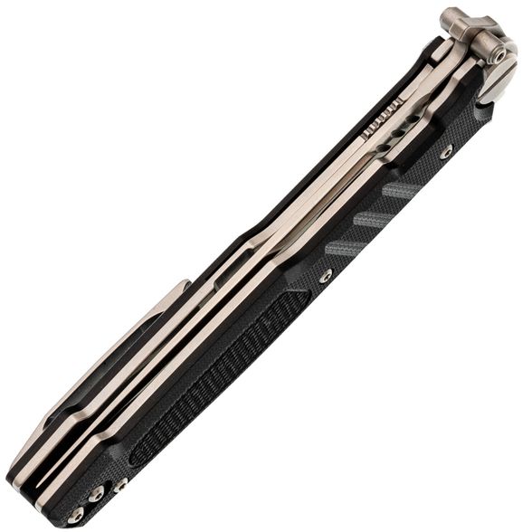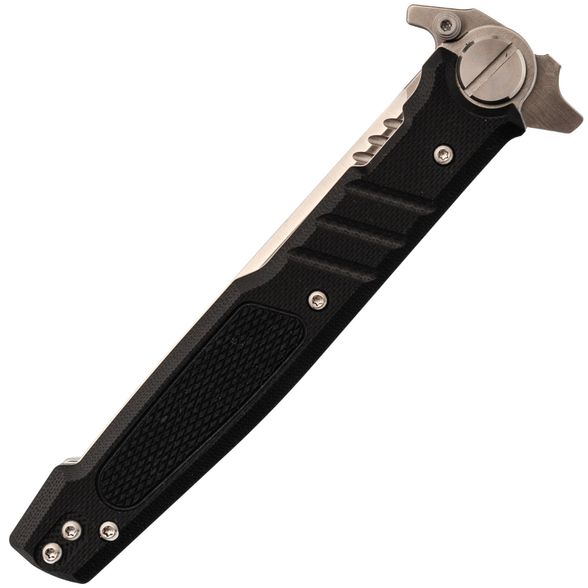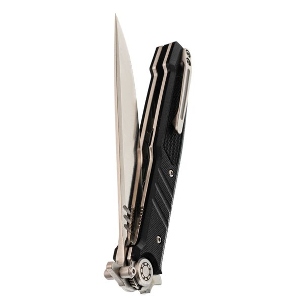 Рукоять выполнена в стиле техно из стеклотекстолита G10, материала, известного своей прочностью и устойчивостью к воздействию окружающей среды. Замок Liner-Lock обеспечивает надёжную фиксацию клинка в рабочем положении. Для лучшего сцепления с рукой рукоять имеет фрезеровку и оружейную насечку, что позволяет уверенно удерживать нож даже в сложных условиях.