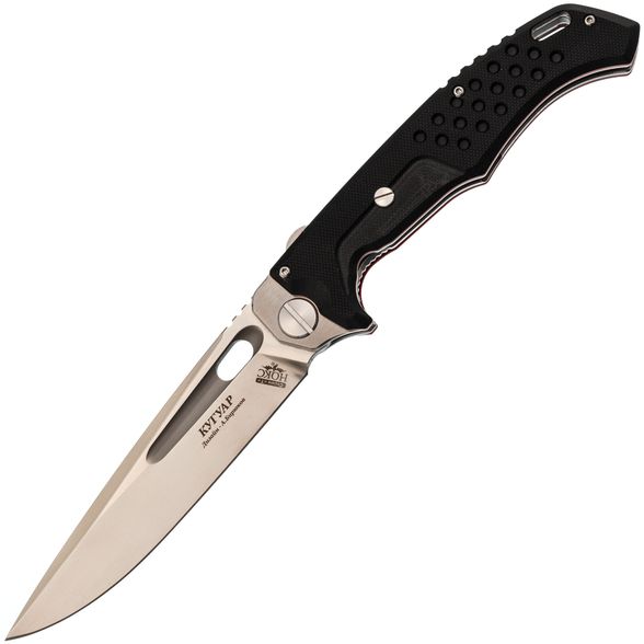 Рукоять Кугуара С была разработана с акцентом на удобство. Её форма идеально ложится в руку, а текстурированные накладки из G10 предотвращают скольжение, обеспечивая стабильное и уверенное удержание. Темлячное отверстие делает нож ещё более удобным для использования в любых условиях.