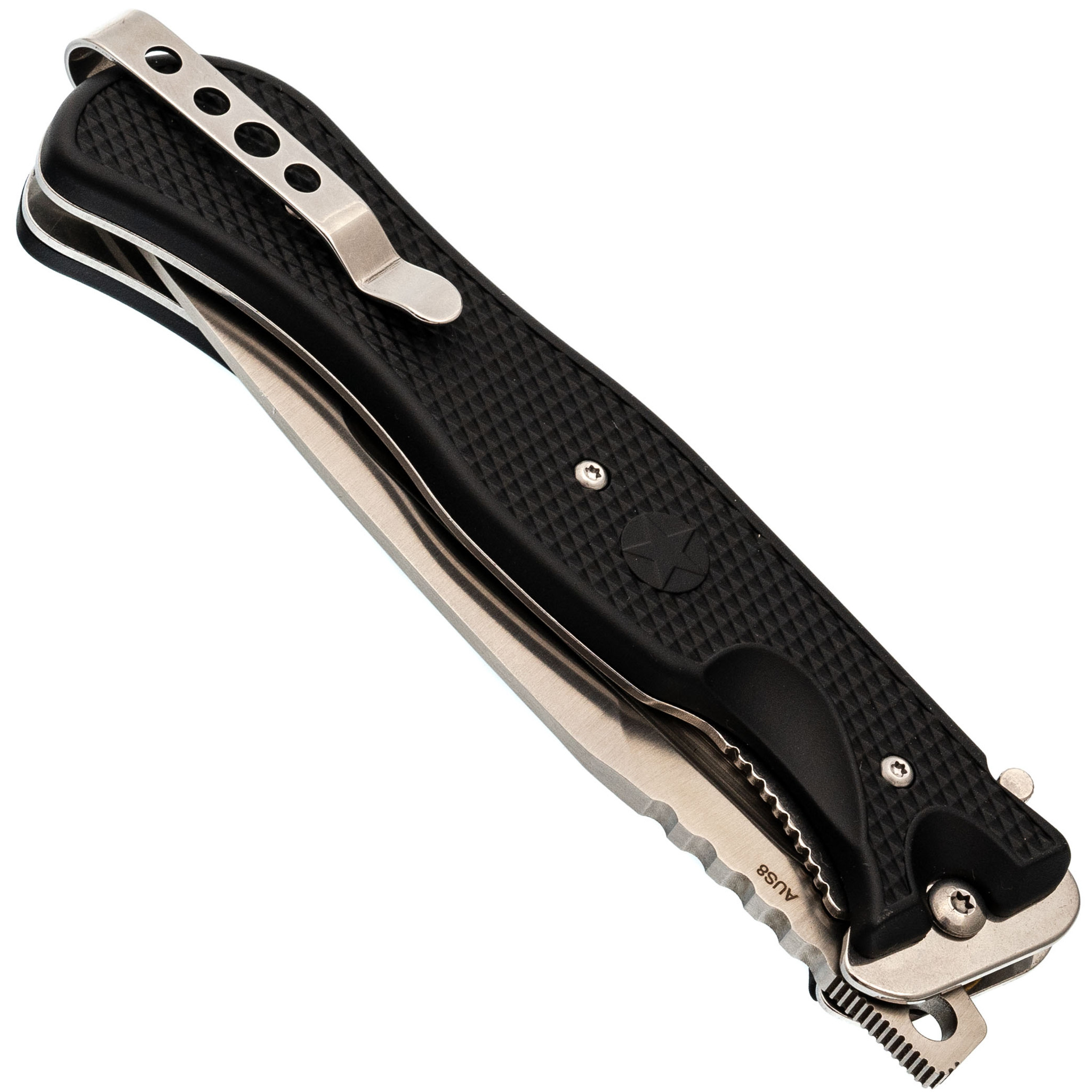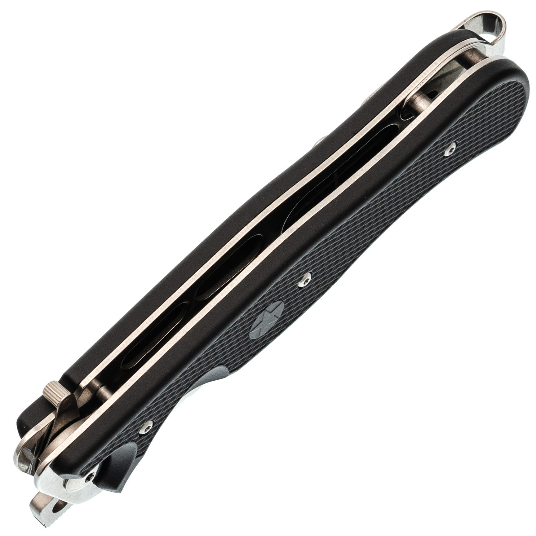 Чёрная рукоять с насечкой на накладках обеспечивает отличное сцепление и удобство в использовании, что делает нож идеальным для повседневных задач и работы в сложных условиях.