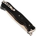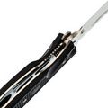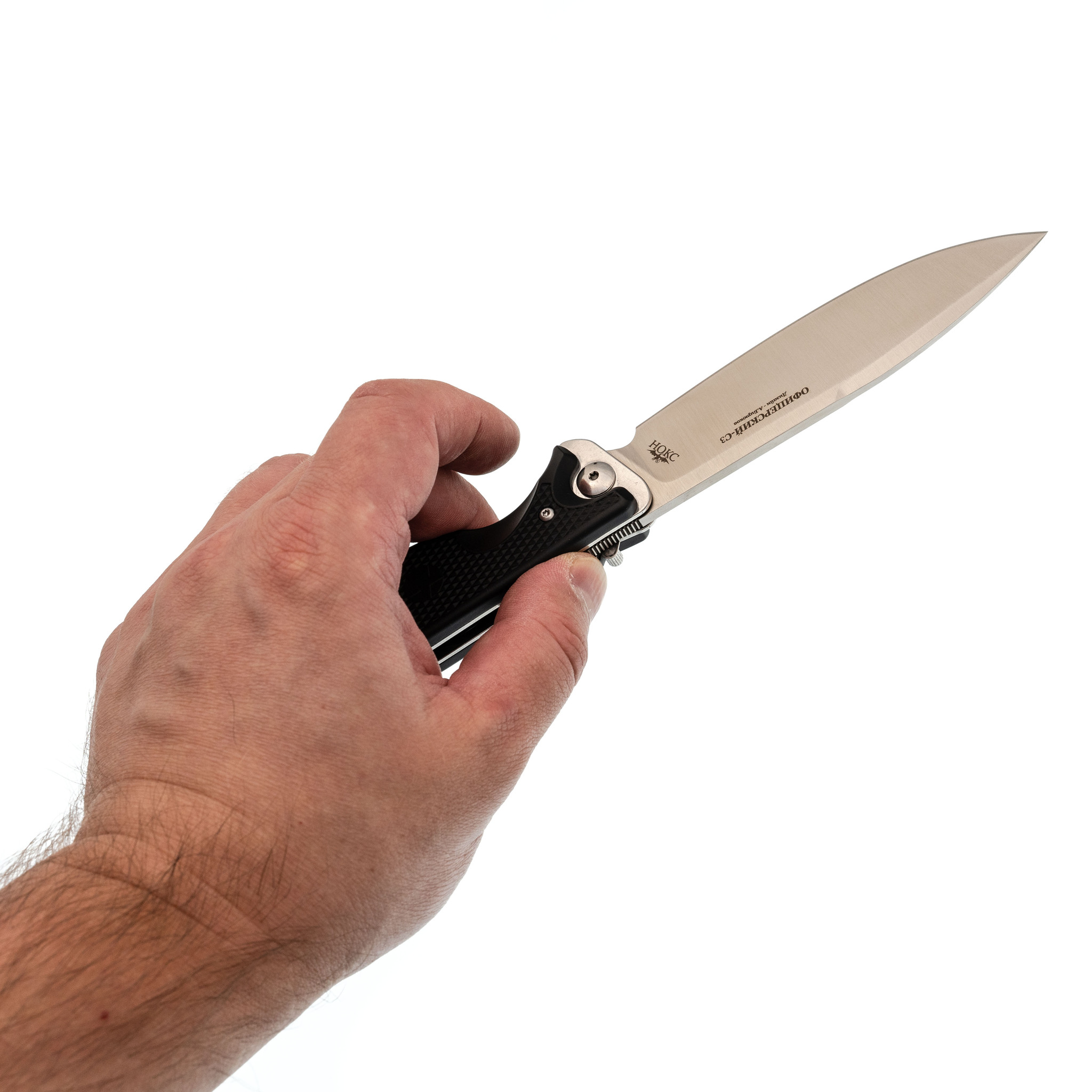 Насечка на накладках рукояти делает хват ещё более уверенным, обеспечивая стабильность при работе с ножом в сложных условиях. Чёрный строгий цвет рукояти делает её не только практичной, но и элегантной.