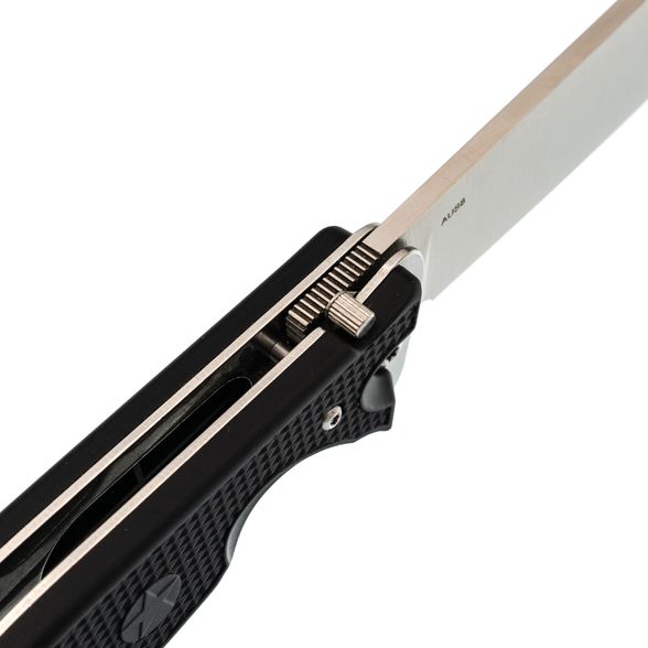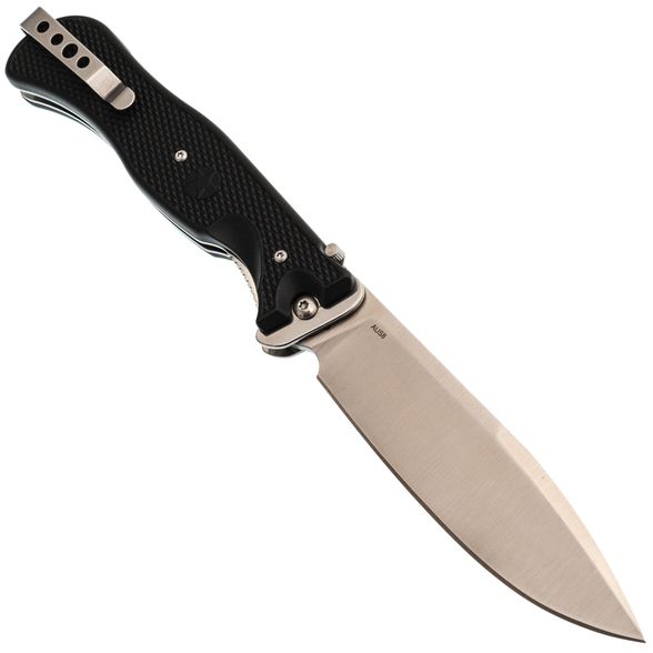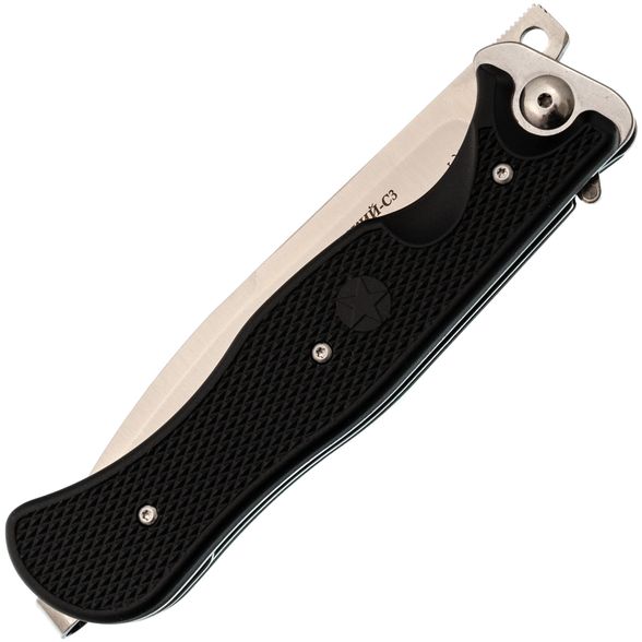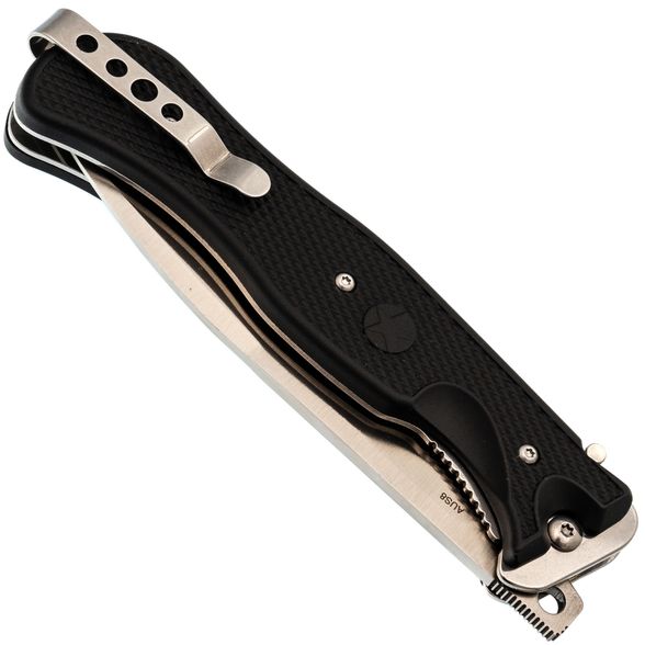 Сталь AUS-8 является оптимальным вариантом для создания универсальных клинков. Она обладает хорошими режущими свойствами, стойкостью к коррозии и относительно лёгкой заточкой. Черное покрытие, нанесённое на клинок, увеличивает его стойкость к внешним воздействиям, обеспечивая долговечность и защиту от влаги.