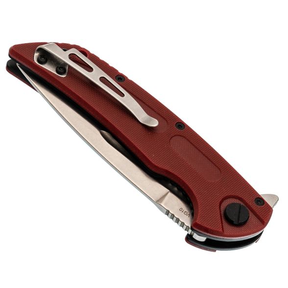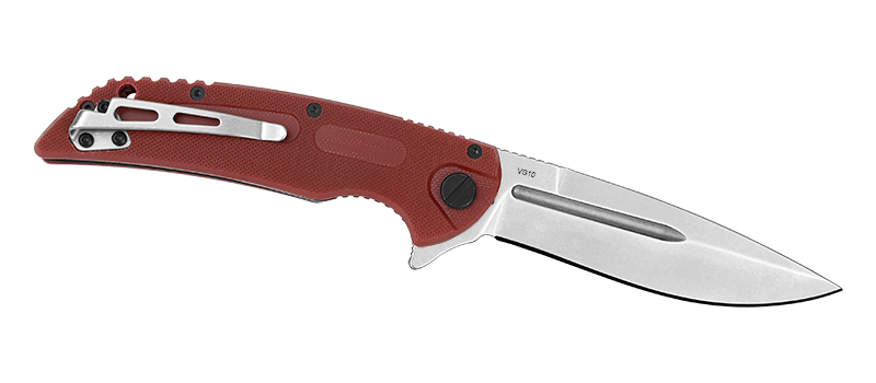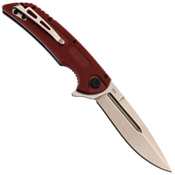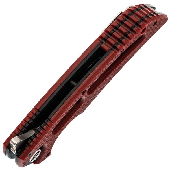За хват здесь отвечают сразу несколько решений. Во-первых, крупная подпальцевая выемка на "брюшке" рукояти - палец ложится как влитой. Во-вторых, насечки на спинке рукояти дают дополнительное сцепление, даже если рука мокрая или в масле. Сама рукоять анатомичная, с легкими изгибами. Текстура G10 шершавая, но не наждачная - карманы не протирает, а в ладони сидит мёртво. Сквозные отверстия в накладках - это не только дизайн, но и практичность: продувается и промывается легко. Замок - классический Liner Lock (стальная пластина подкладывается под хвост клинка). Исполнение надежное, с хорошим заходом, без микро-люфтов, и со временем поджимается простым нажатием. Клипса съёмная, под правшей, носить можно глубоко в кармане или на ремне. И да, осевой узел на подшипниках - открывается одной рукой плавно и приятно, даже если вы в перчатках.