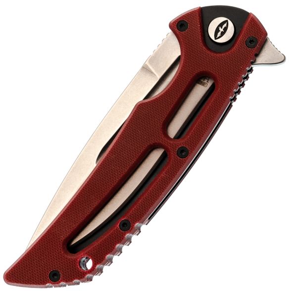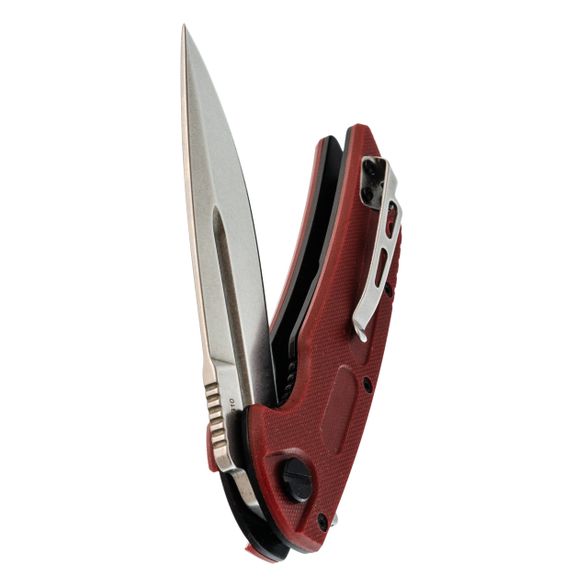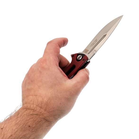 Клинок выполнен в форм-факторе "Spear Point" - это такое универсальное остриё, которое и колет отлично, и режет благодаря плавной рекурве (изгибу режущей кромки). Спуски вогнутые, нож просто врезается в материал. Обратите внимание на фальшлезвие на обухе - оно облегчает клинок и придает тот самый узнаваемый "тактический" профиль. Флиппер здесь не просто для красоты: это и рычаг для быстрого открывания, и серьёзный упор для пальцев при работе. Когда вы нажимаете на него, клинок вылетает мгновенно на подшипниках, а после открытия он становится частью рукояти, блокируя руку от соскальзывания на лезвие. Покрытие клинка практичное, матовое - бликов на солнце не ловит, да и царапины от работы на нём менее заметны, чем на полировке.