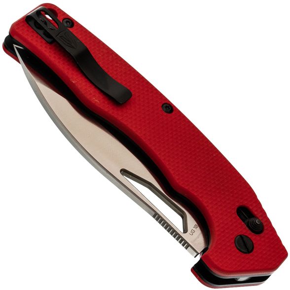 Рукоять с изогнутой формой и подпальцевыми выемками делает нож удобным в руке. Поднятое положение рукояти относительно клинка позволяет комфортно резать на плоской поверхности. Для ношения есть клипса глубокой посадки и отверстие под темляк. Замок Crossbar-Lock обеспечивает надёжную фиксацию и удобное управление.