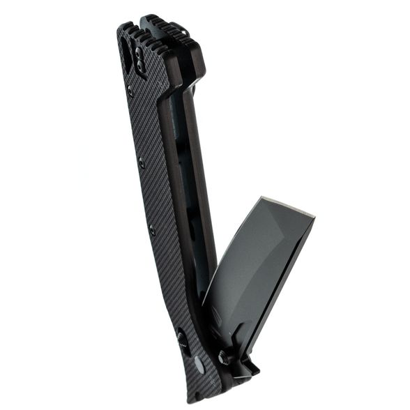 Рукоять ножа выполнена с выраженной изогнутой формой и крупной пятерневой выемкой, что обеспечивает удобный и контролируемый хват. Крупный упор защищает руку при нагрузках, а осевой узел на толстых бронзовых шайбах легко справляется с боковыми нагрузками и устойчив к загрязнениям. Ось под плоский шлиц позволяет быстро отрегулировать нож без специнструмента. За безопасность отвечает Crossbar-Lock - аналог Axis-Lock, но с толстыми пружинами и регулировкой усилия. В конструкции предусмотрена переставляемая клипса, темлячное отверстие и все детали для простой адаптации под пользователя.