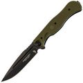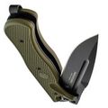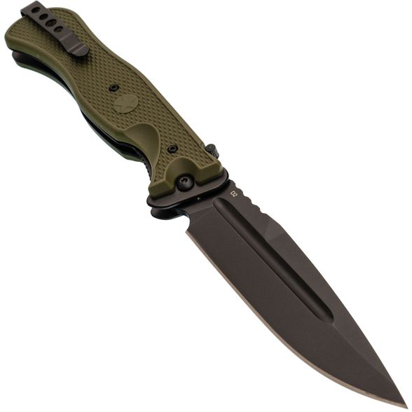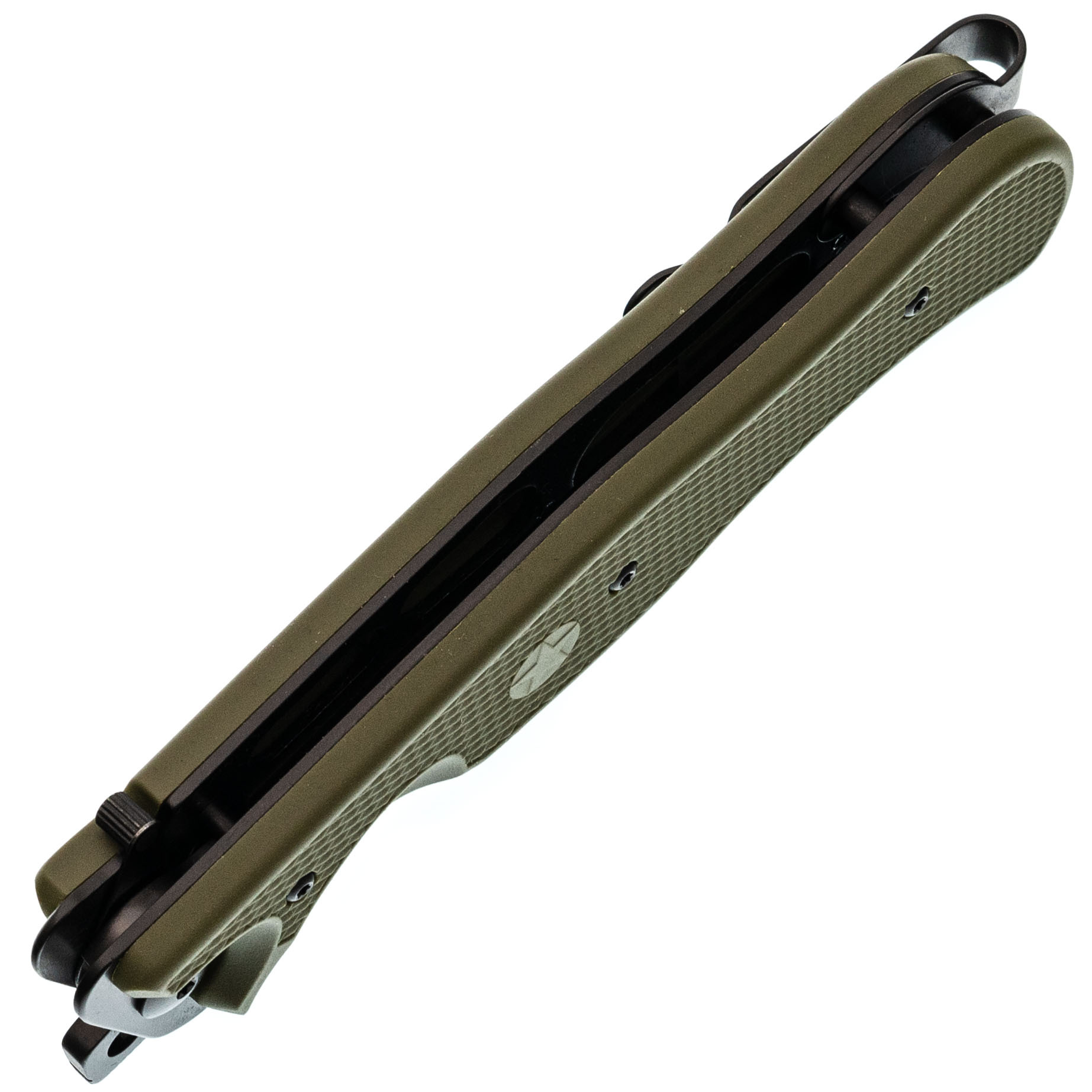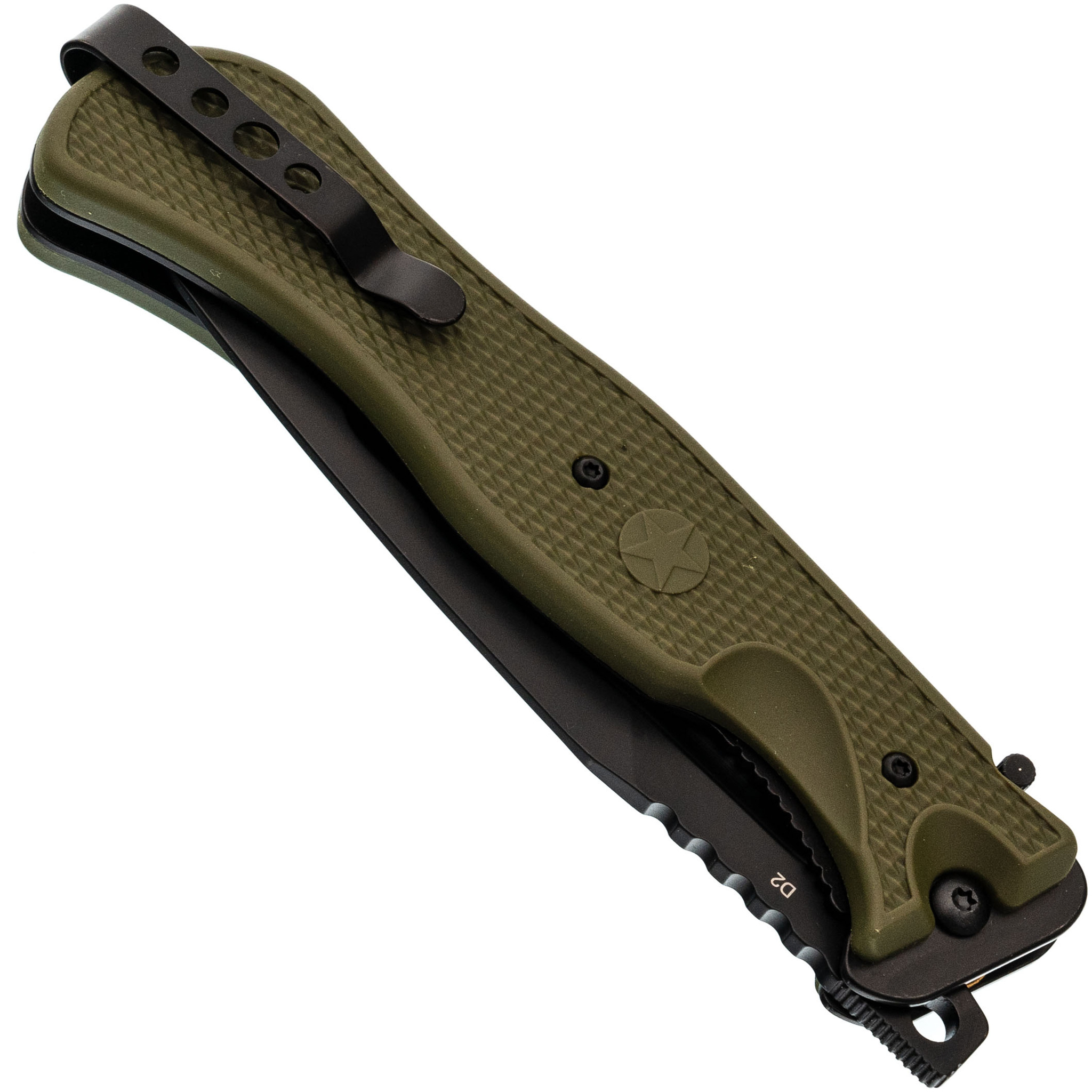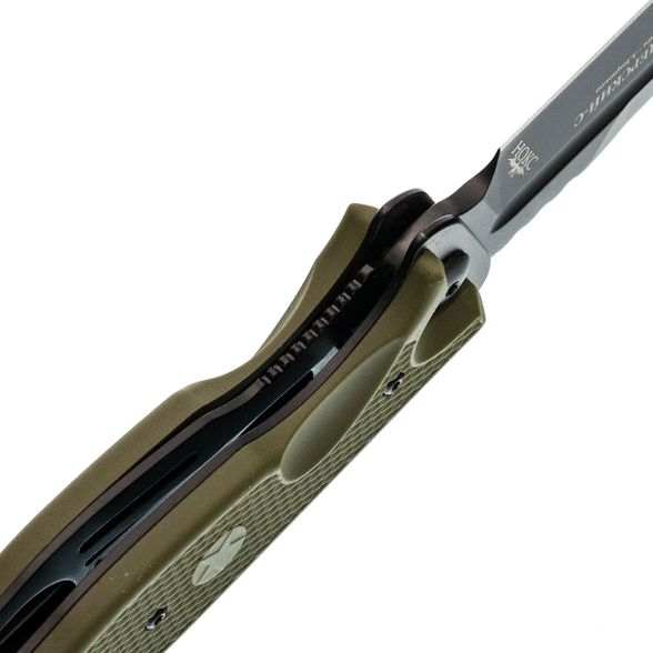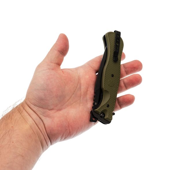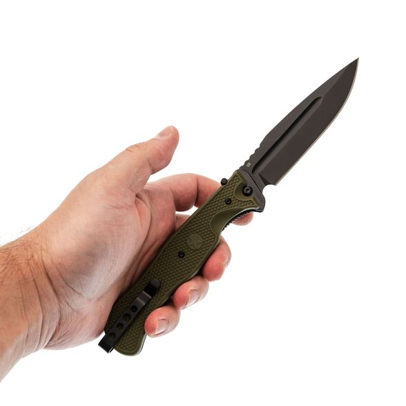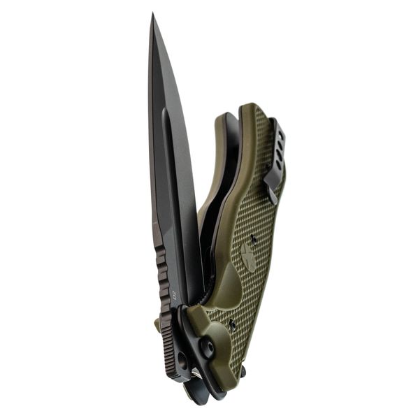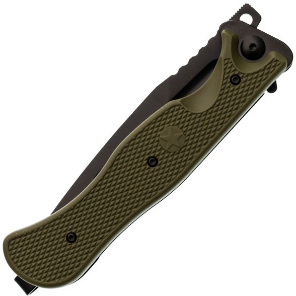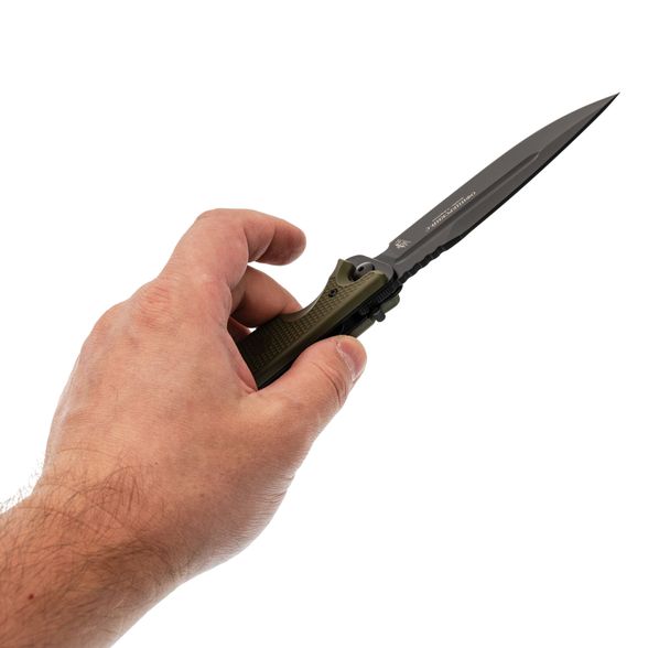 Рукоять с насечкой на накладках обеспечивает надёжный хват, даже при использовании в дождливую или влажную погоду. Строгий зелёный цвет накладок на пластике и нержавеющей стали подчеркивает военный стиль и акцент на практичность.