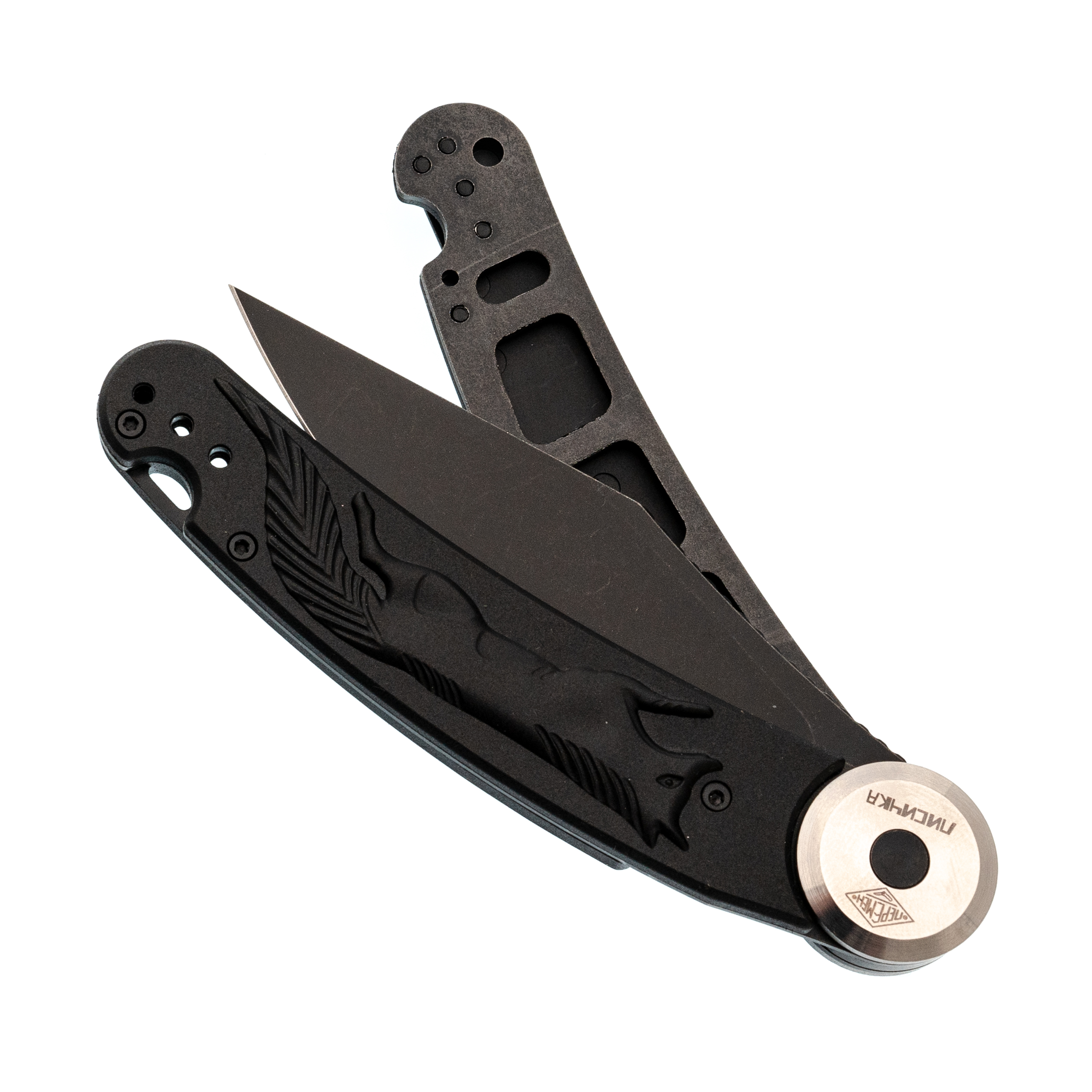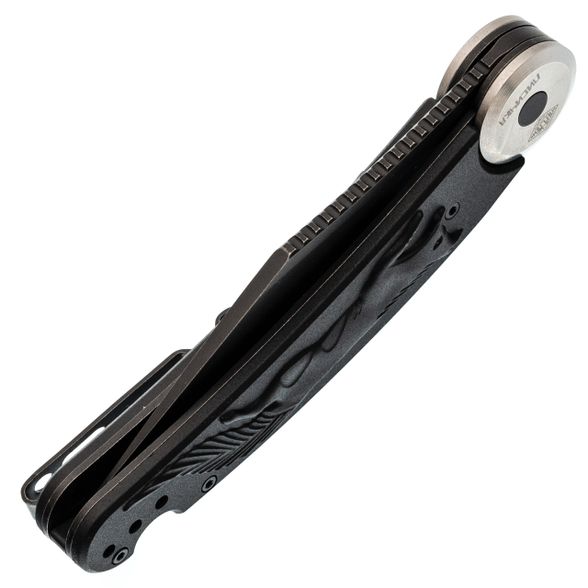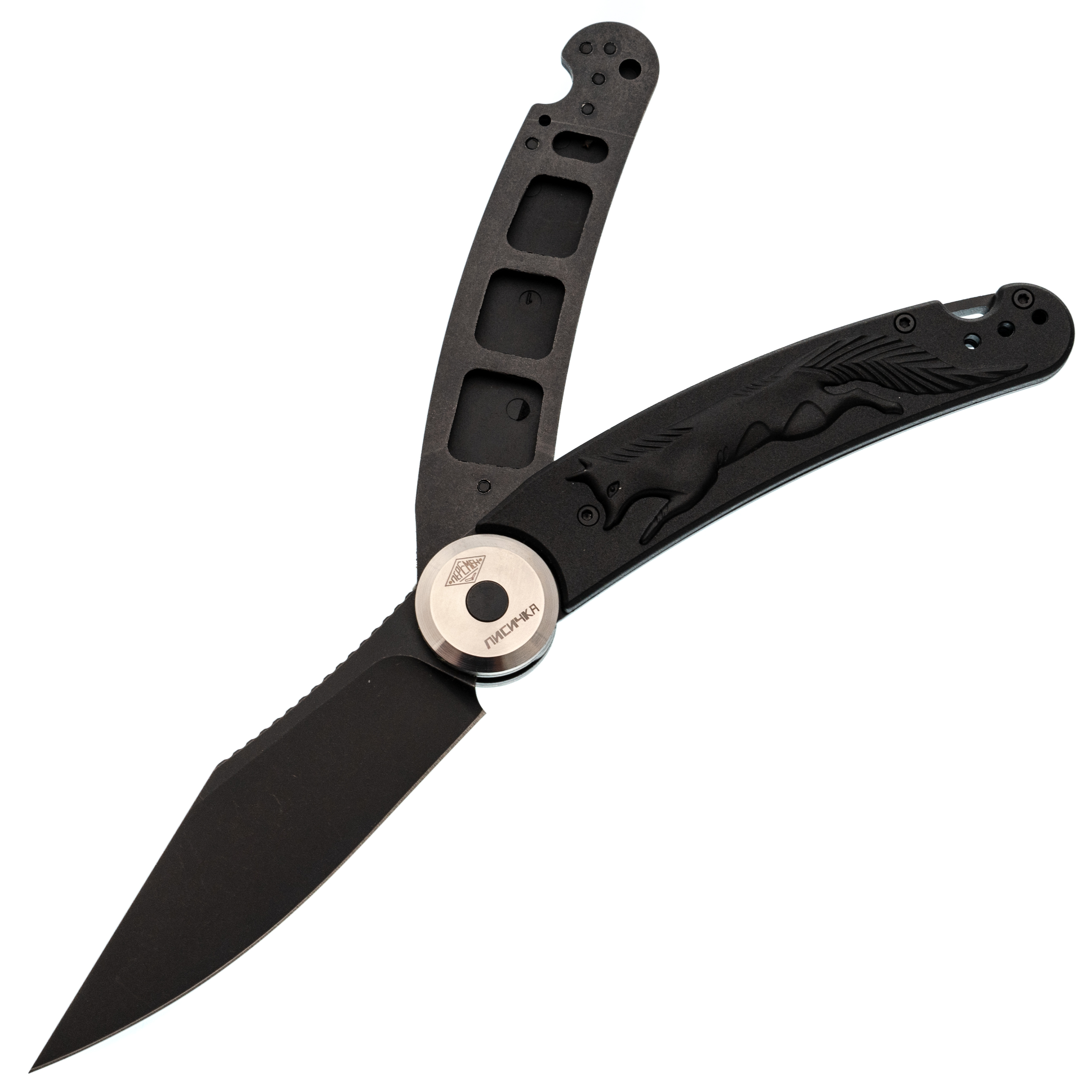 Здесь применена оригинальная конструкция: рукоять разделяется на две половины и вращается вокруг оси. В открытом положении она фиксируется штифтом, превращая нож в монолитную конструкцию. Это очень надежный замок, который исключает случайное складывание во время работы. Плата за такую жесткость - необходимость открывать нож двумя руками, но для спокойного использования это не проблема. Накладки выполнены из черного FRN с рельефным рисунком в виде лисицы, что добавляет ножу индивидуальности и улучшает сцепление с рукой.